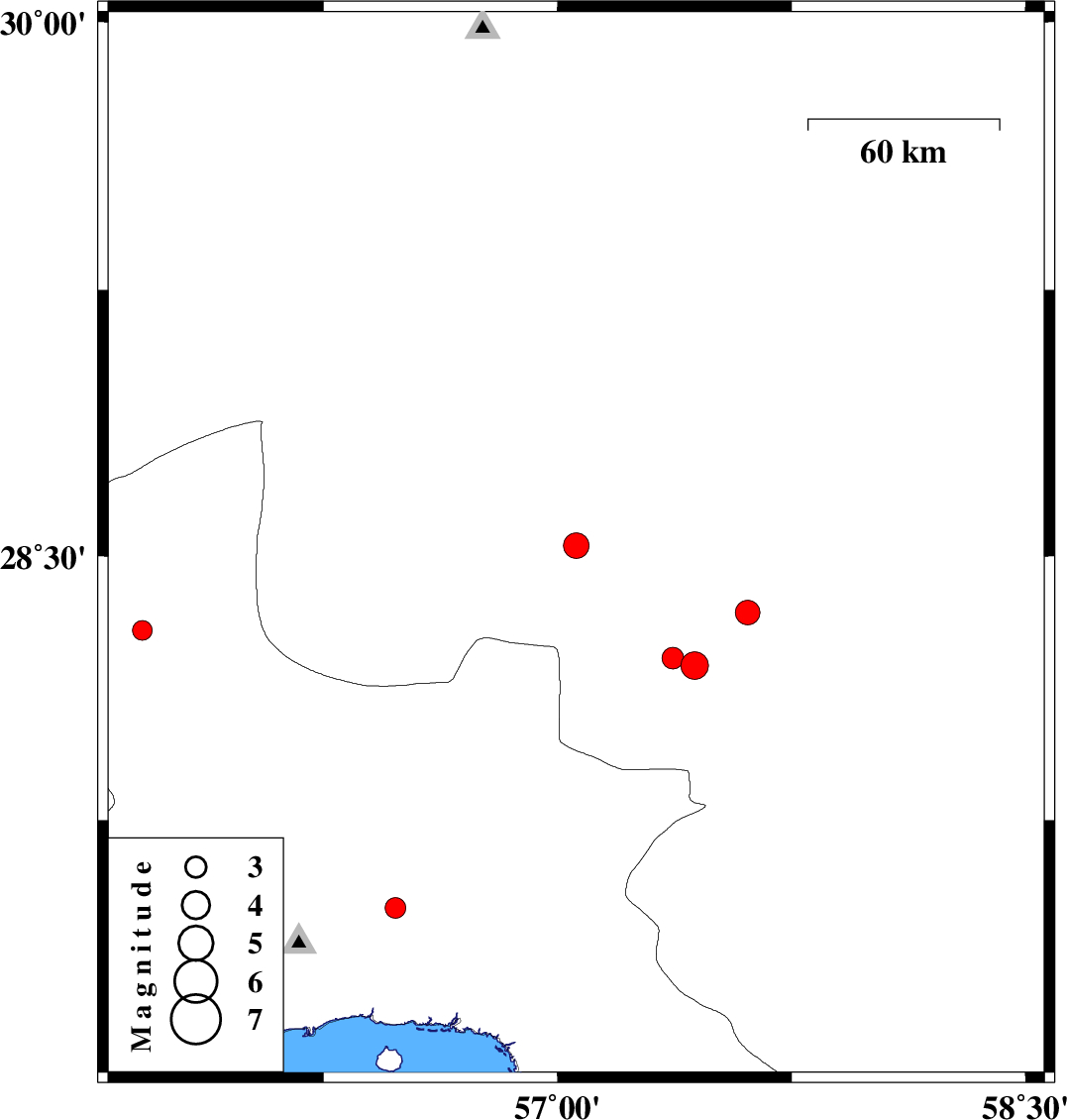 | 2012/06/18 | 15:40:40.5 | 20:10:40.5 | 28.21 | 57.37 | 14 | ML:3.1 | Kerman Province, 42 km North-West of Kahnuj | ||