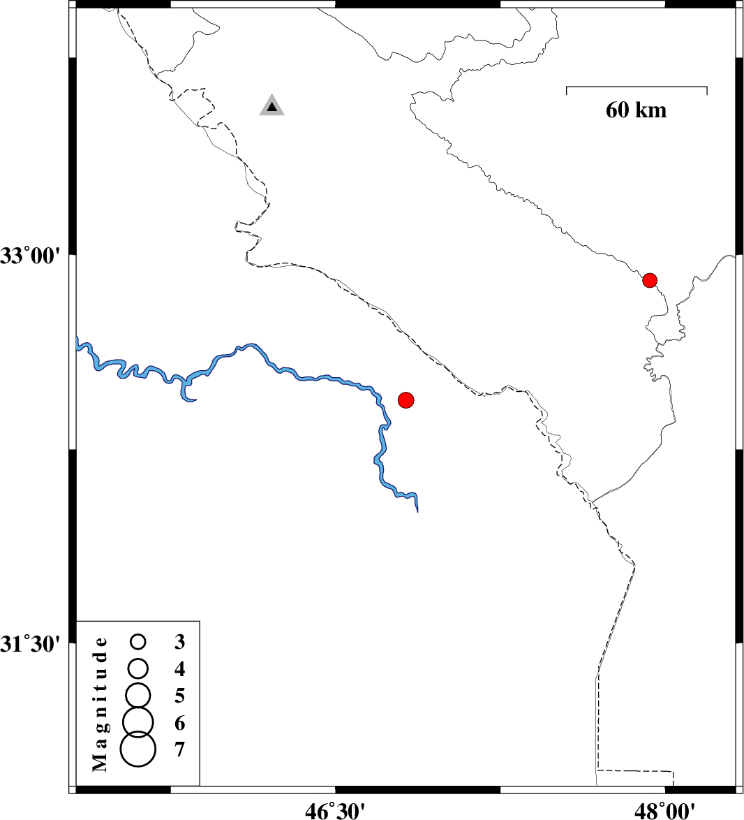 | 2012/06/21 | 01:03:17.9 | 05:33:17.9 | 32.44 | 46.82 | 18 | ML:3.2 | Iraq, 50 km South-West of Dehloran | ||