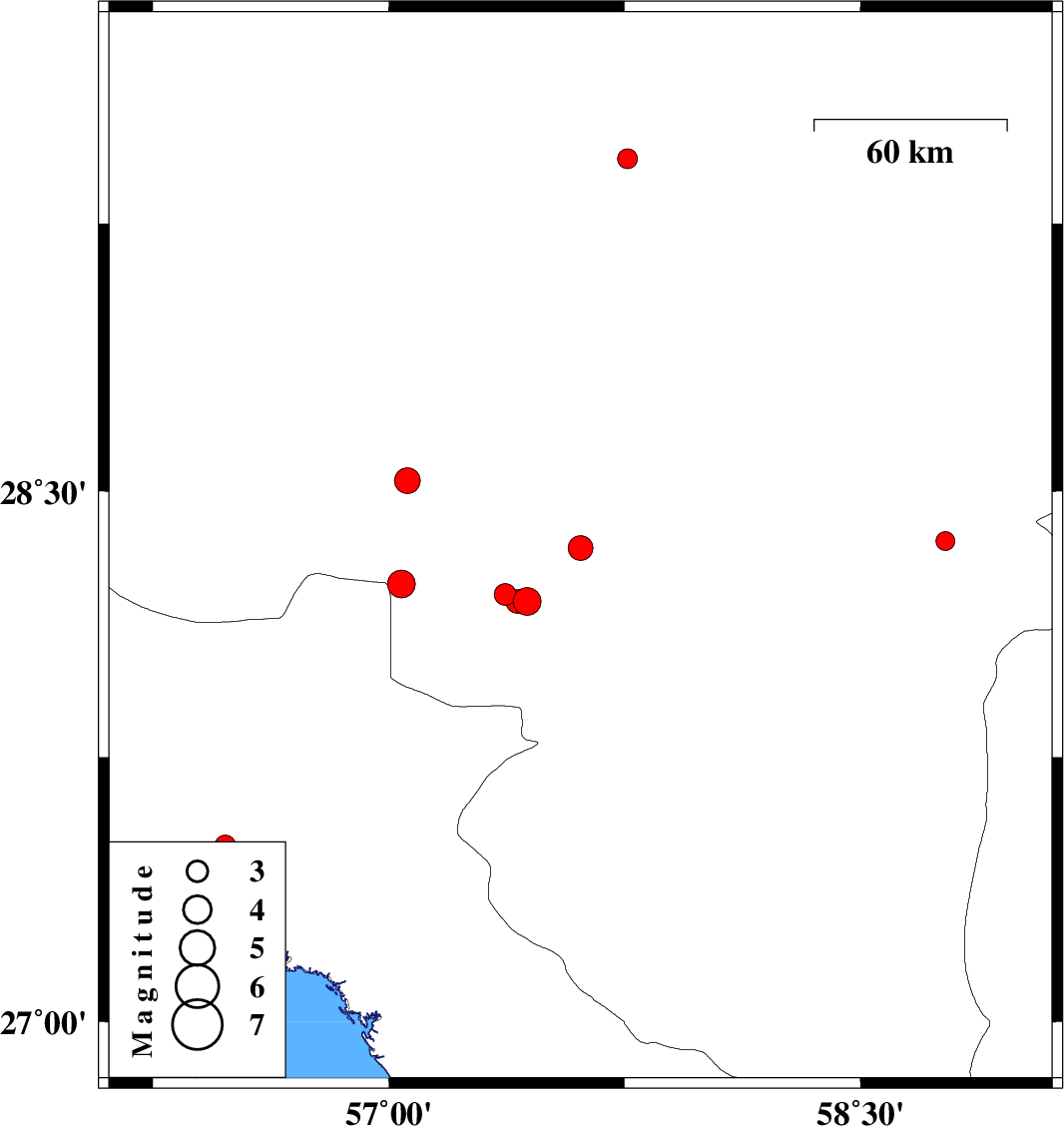 | 2012/05/28 | 10:12:01.8 | 14:42:01.8 | 28.36 | 58.77 | 14 | ML:2.7 | Kerman Province, 92 km South-East of Bam |