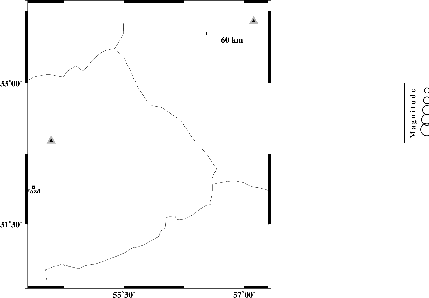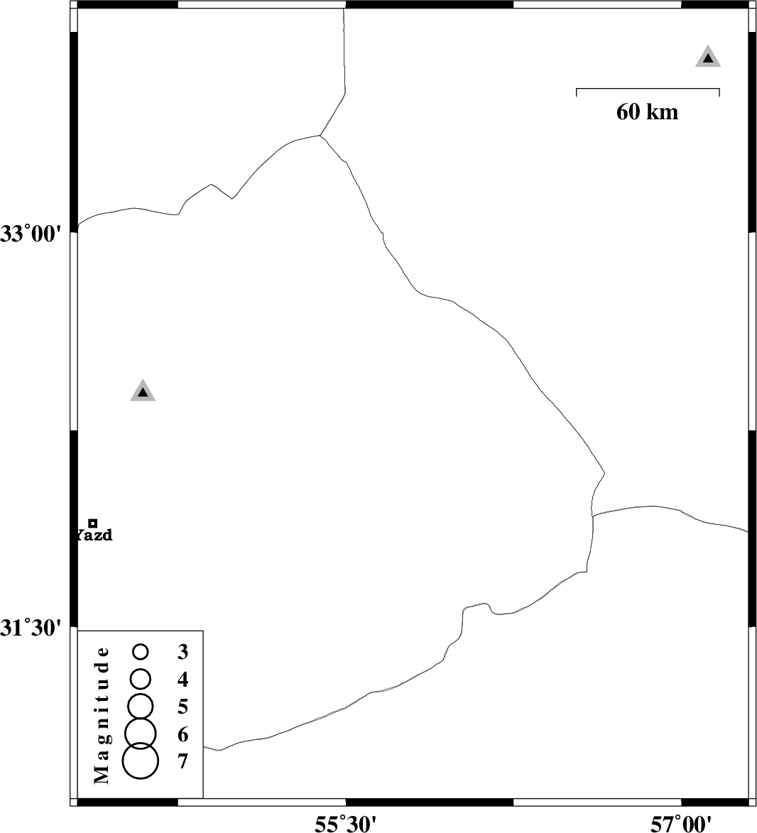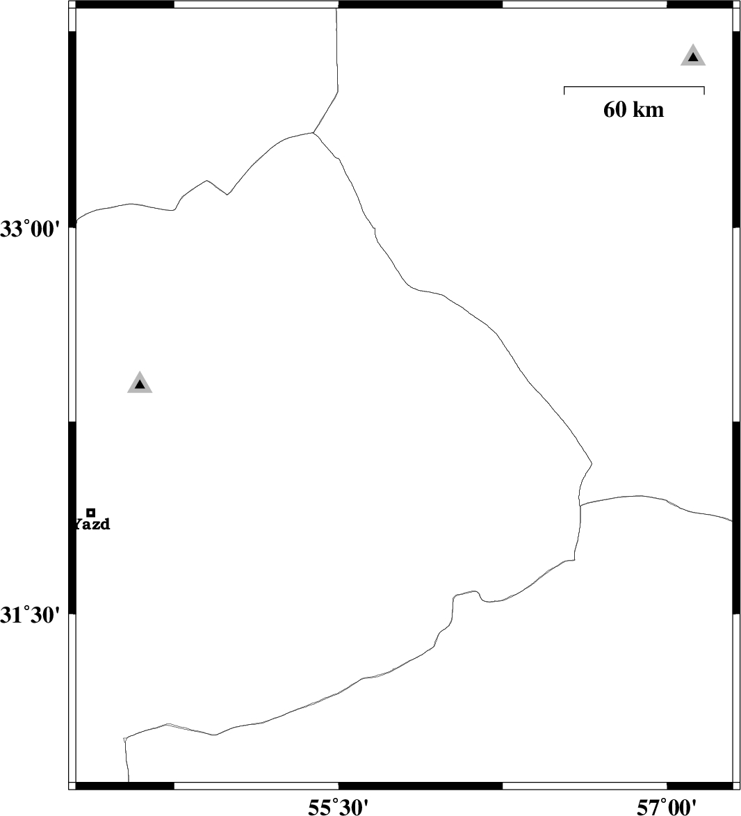 | 2012/06/23 | 05:28:23.4 | 09:58:23.4 | 32.34 | 55.8 | 14 | ML:2.6 | Yazd Province, 90 km North-East of Bafq |