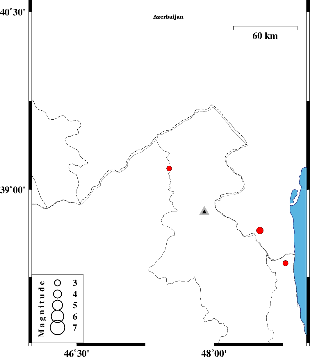 | 2012/06/25 | 03:22:29.2 | 07:52:29.2 | 39.18 | 47.51 | 14 | ML:2.6 | Azarbaijan Sharghi Province, 53 km North-West of Germi | ||