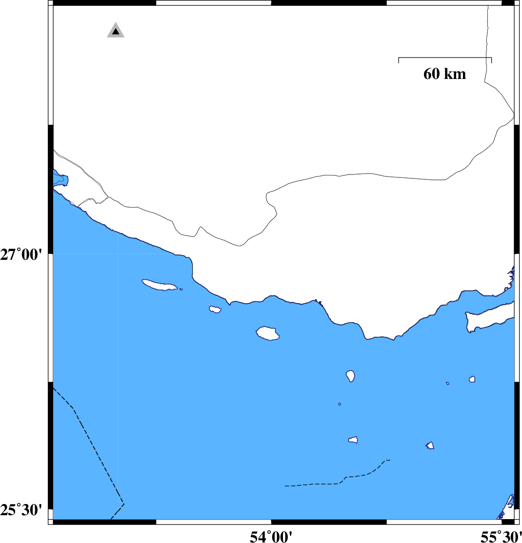 | 2012/06/25 | 22:29:48.6 | 02:59:48.6 | 26.94 | 54.08 | 38 | ML:2.9 | Hormozgan Province, 40 km South-West of Bastak | ||