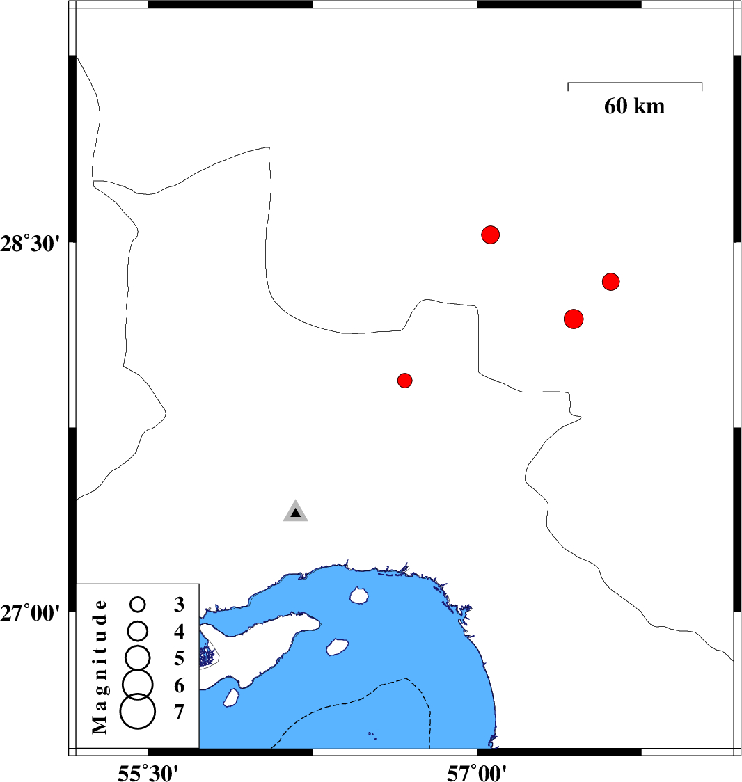 | 2012/06/26 | 18:16:12.1 | 22:46:12.1 | 27.94 | 56.67 | 14 | ML:3 | Hormozgan Province, 101 km West of Kahnuj | ||