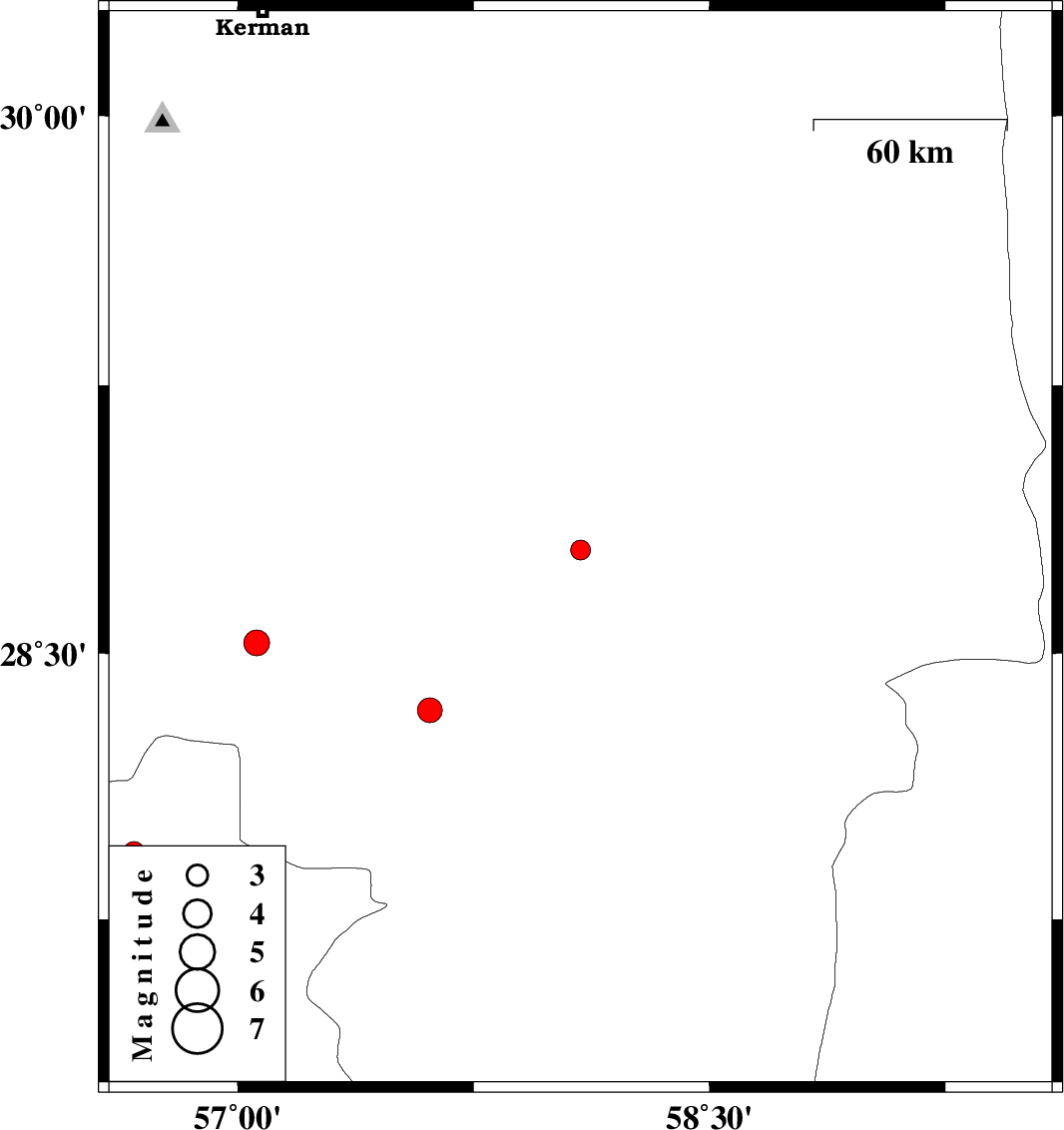 | 2012/06/21 | 01:08:20.9 | 05:38:20.9 | 28.53 | 57.06 | 15 | ML:3.6 | Kerman Province, 68 km South-West of Jiroft |