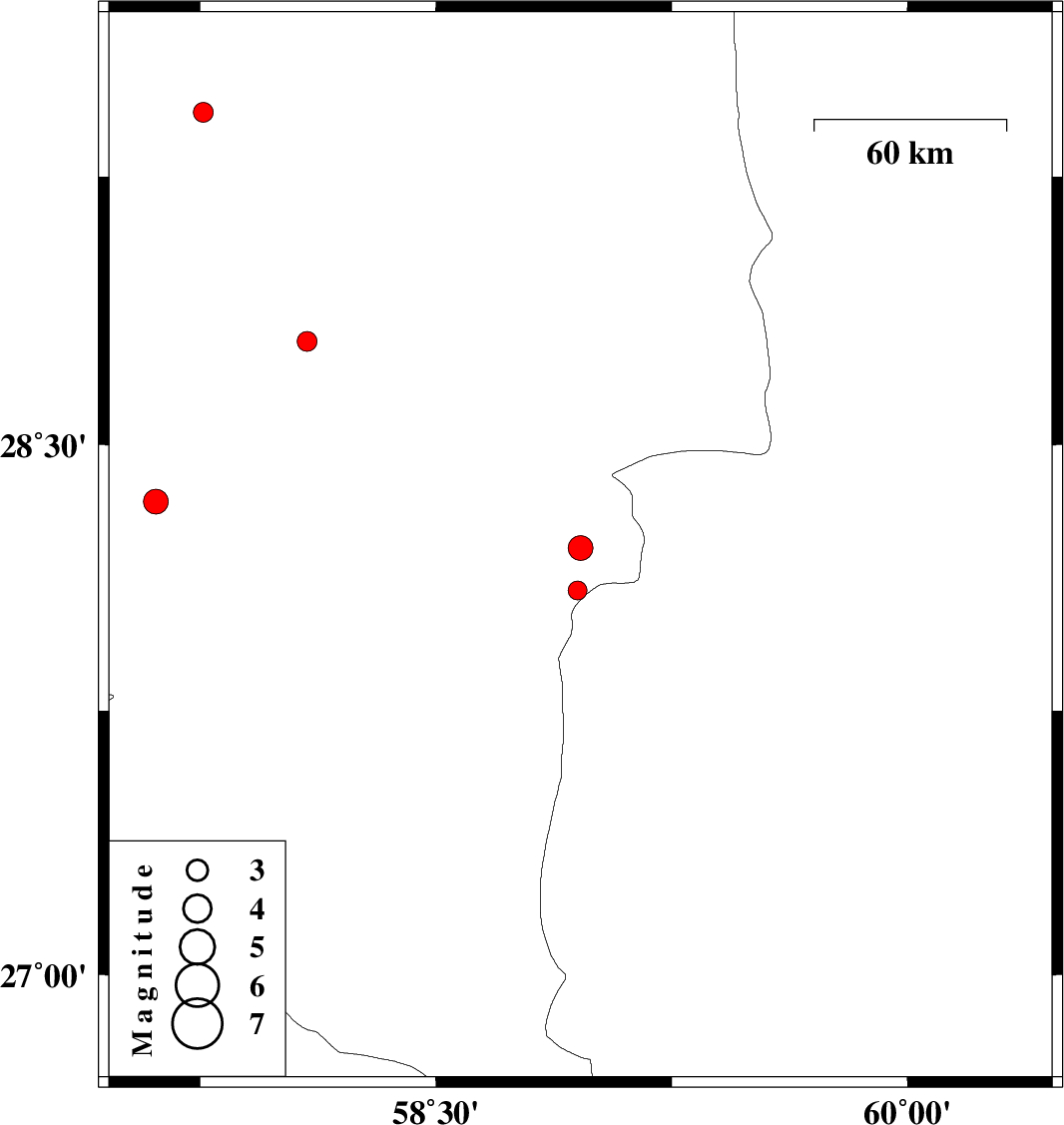 | 2012/06/28 | 18:10:17.7 | 22:40:17.7 | 28.09 | 58.95 | 14 | ML:2.7 | Kerman Province, 124 km North-East of Kahnuj | ||