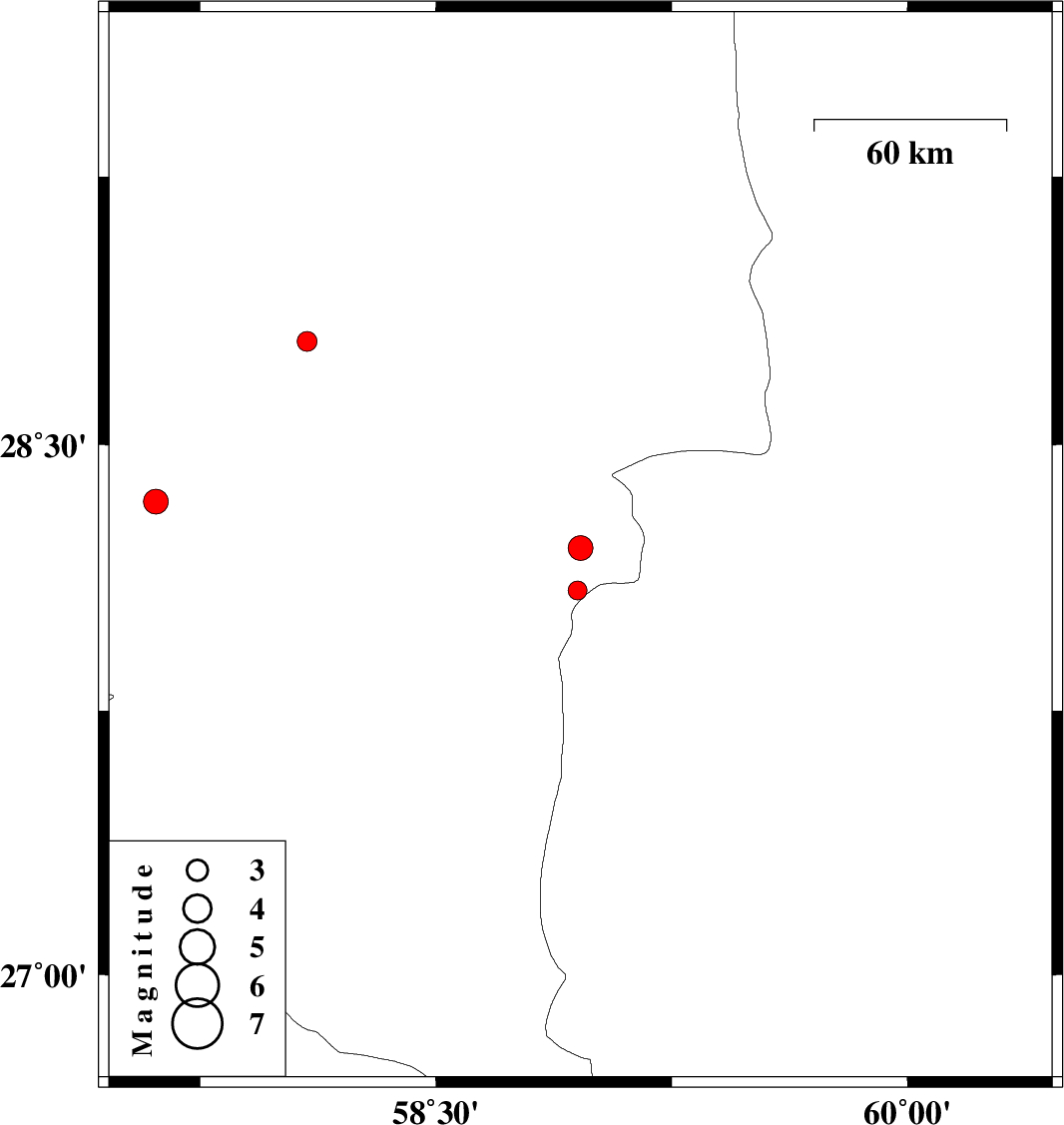 | 2012/06/28 | 18:10:17.7 | 22:40:17.7 | 28.09 | 58.95 | 14 | ML:2.7 | Kerman Province, 124 km North-East of Kahnuj | ||