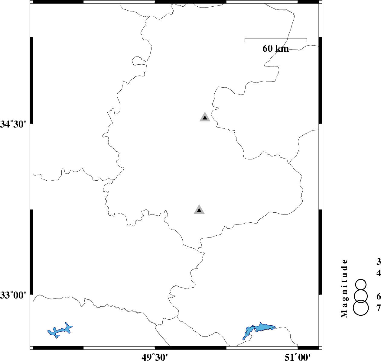 | 2012/06/28 | 17:01:38.9 | 21:31:38.9 | 34.16 | 48.51 | 6 | ML:2.5 | Hamedan Province, 14 km East of Nahavand | ||