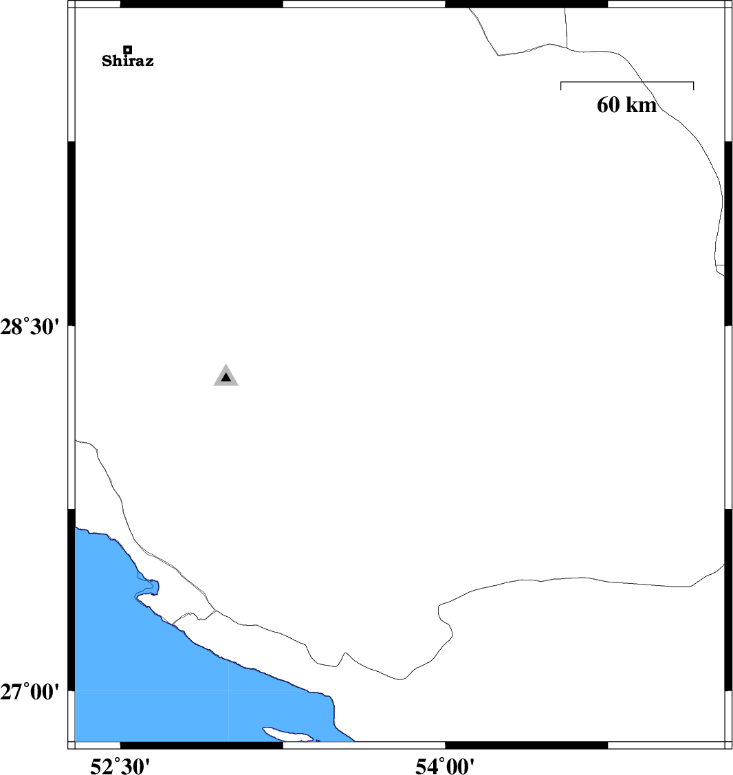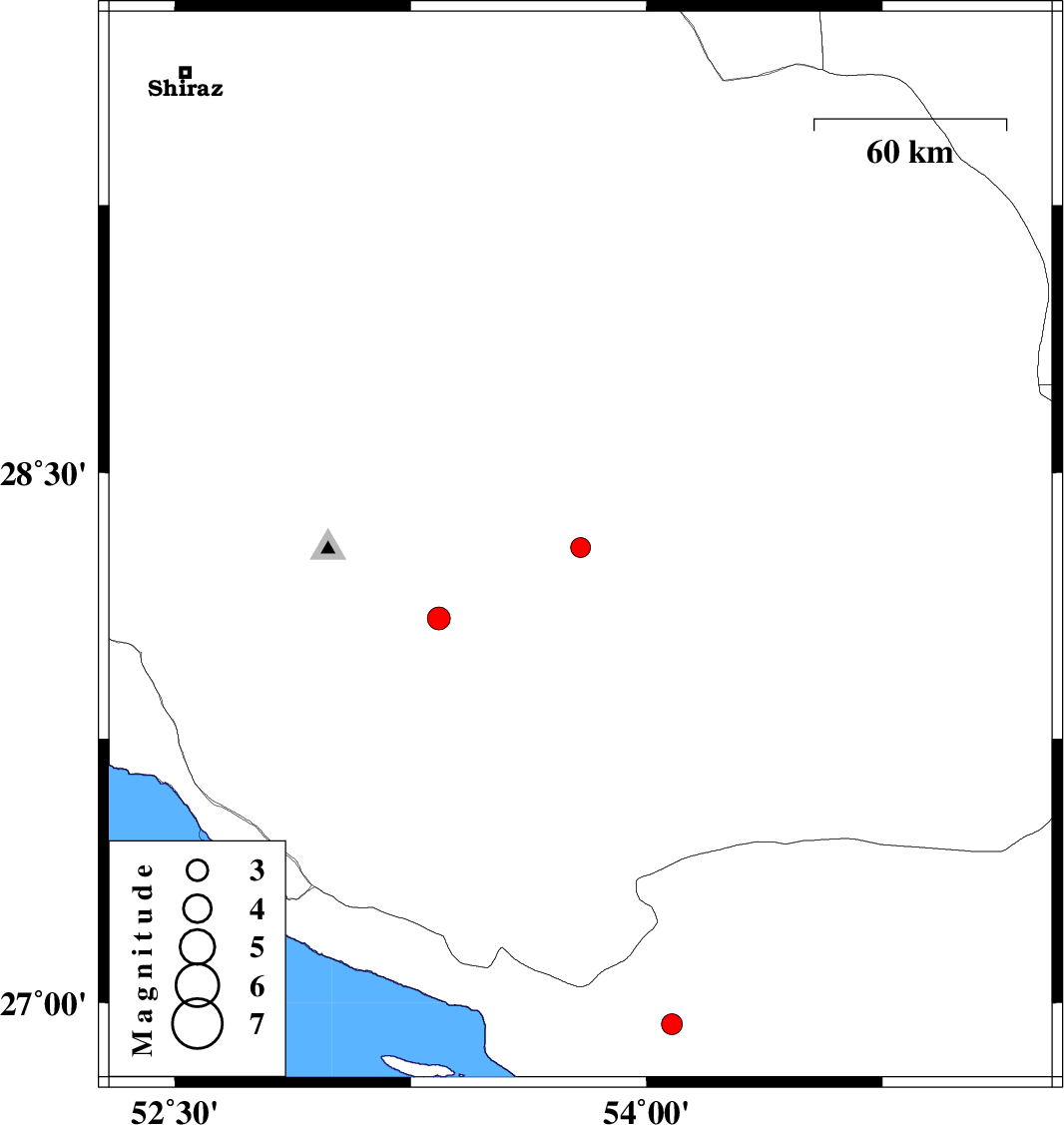 | 2012/06/23 | 09:03:25.9 | 13:33:25.9 | 28.09 | 53.34 | 6 | ML:3.2 | Fars Province, 50 km South-West of Jahrom |