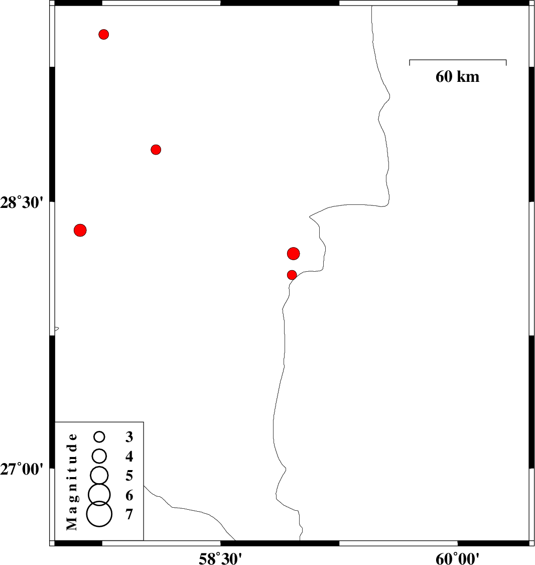 | 2012/06/28 | 18:10:17.7 | 22:40:17.7 | 28.09 | 58.95 | 14 | ML:2.7 | Kerman Province, 124 km North-East of Kahnuj | ||