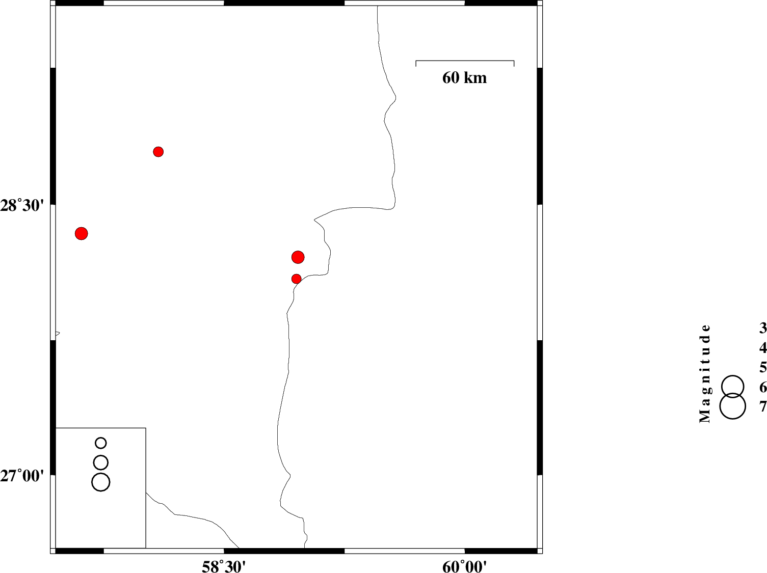 | 2012/06/28 | 18:10:17.7 | 22:40:17.7 | 28.09 | 58.95 | 14 | ML:2.7 | Kerman Province, 124 km North-East of Kahnuj | ||