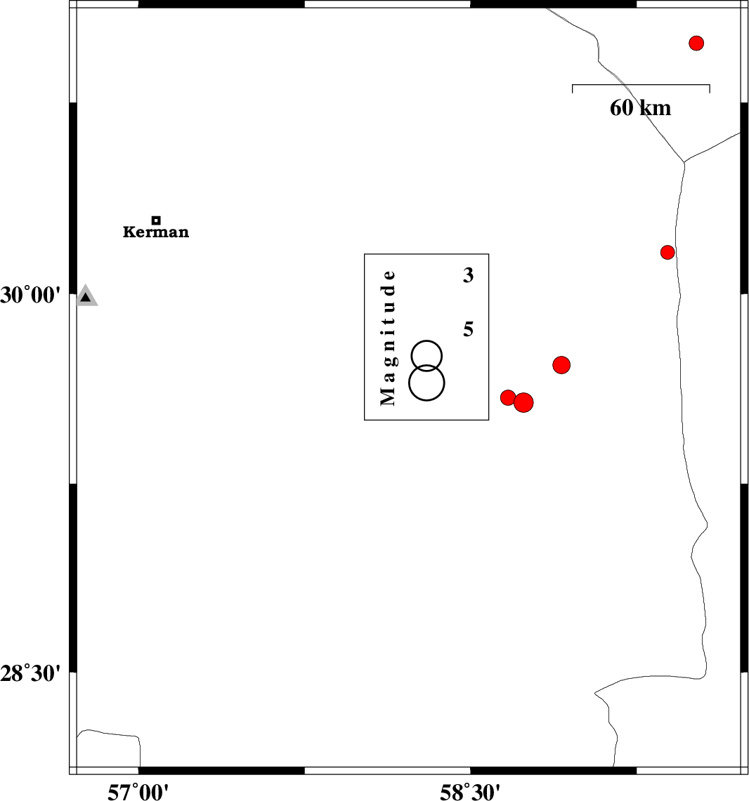 | 2012/06/28 | 11:27:37.5 | 15:57:37.5 | 28.21 | 58.96 | 15 | ML:3.5 | Kerman Province, 116 km South-East of Bam | ||