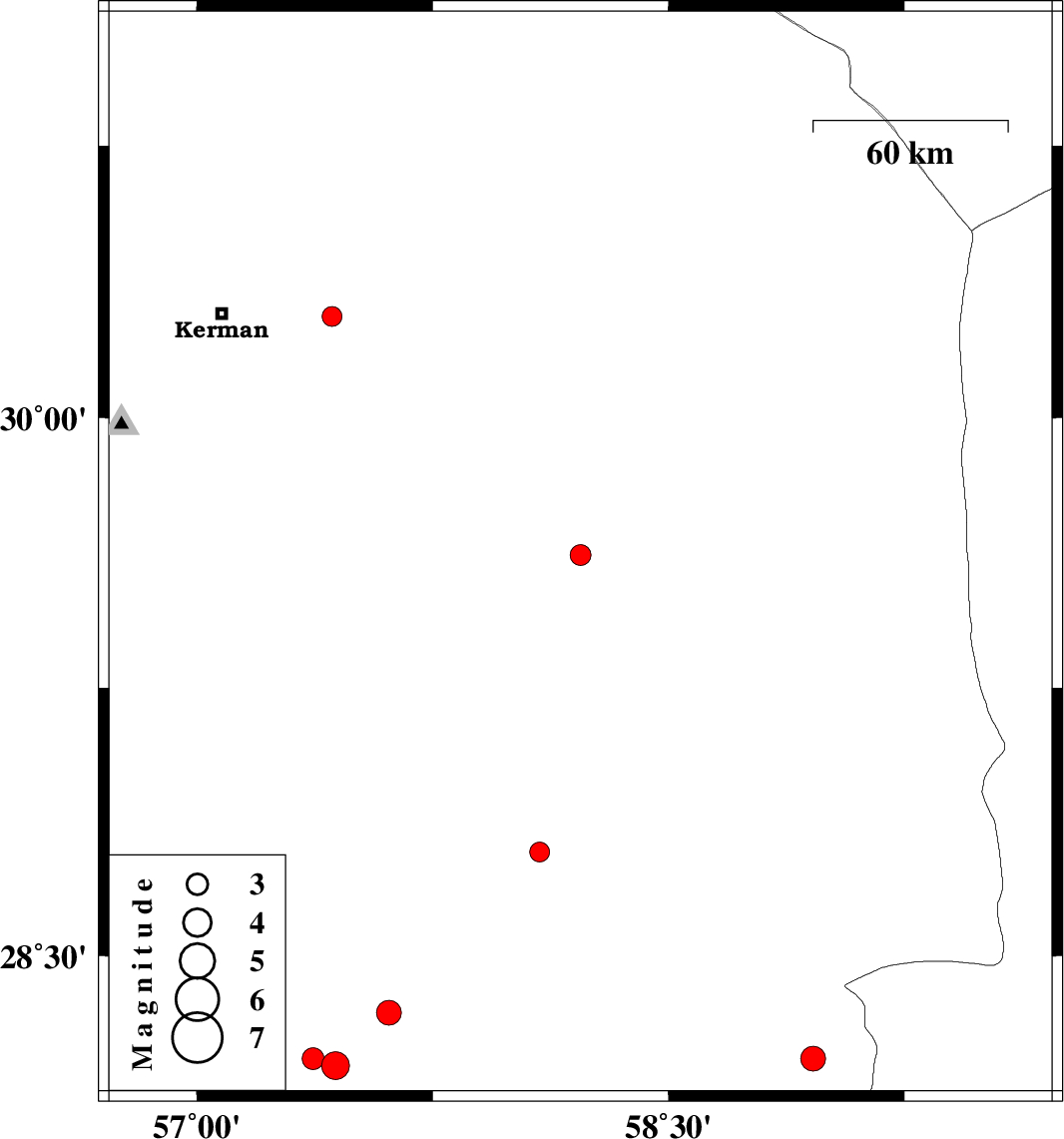 | 2012/06/30 | 14:35:59.2 | 19:05:59.2 | 29.62 | 58.22 | 14 | ML:3 | Kerman Province, 59 km North-West of Bam | ||