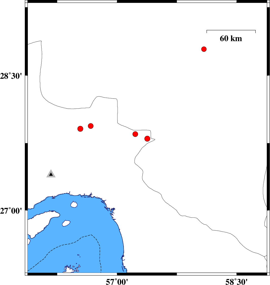 | 2012/06/29 | 12:28:13.6 | 16:58:13.6 | 27.91 | 56.54 | 14 | ML:3.1 | Hormozgan Province, 85 km North-East of Bandar-e abbas | ||