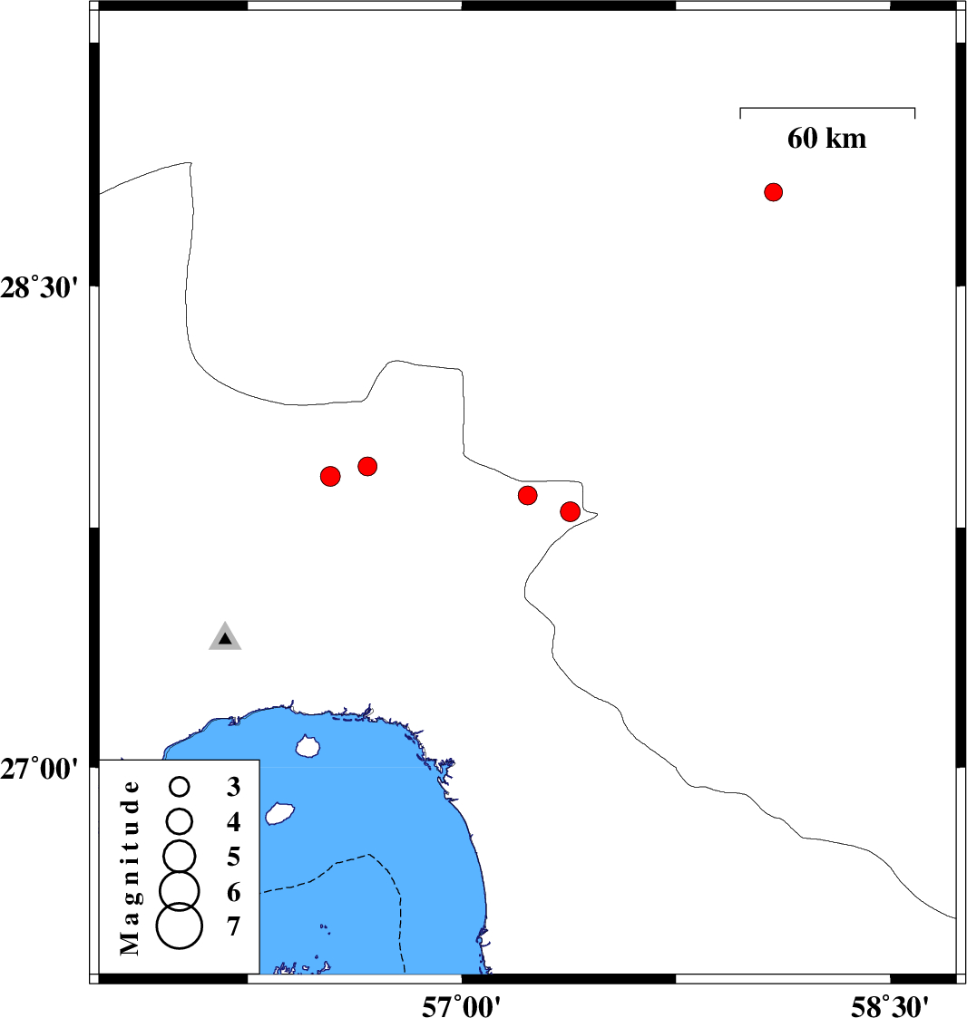 | 2012/06/29 | 12:28:13.6 | 16:58:13.6 | 27.91 | 56.54 | 14 | ML:3.1 | Hormozgan Province, 85 km North-East of Bandar-e abbas | ||