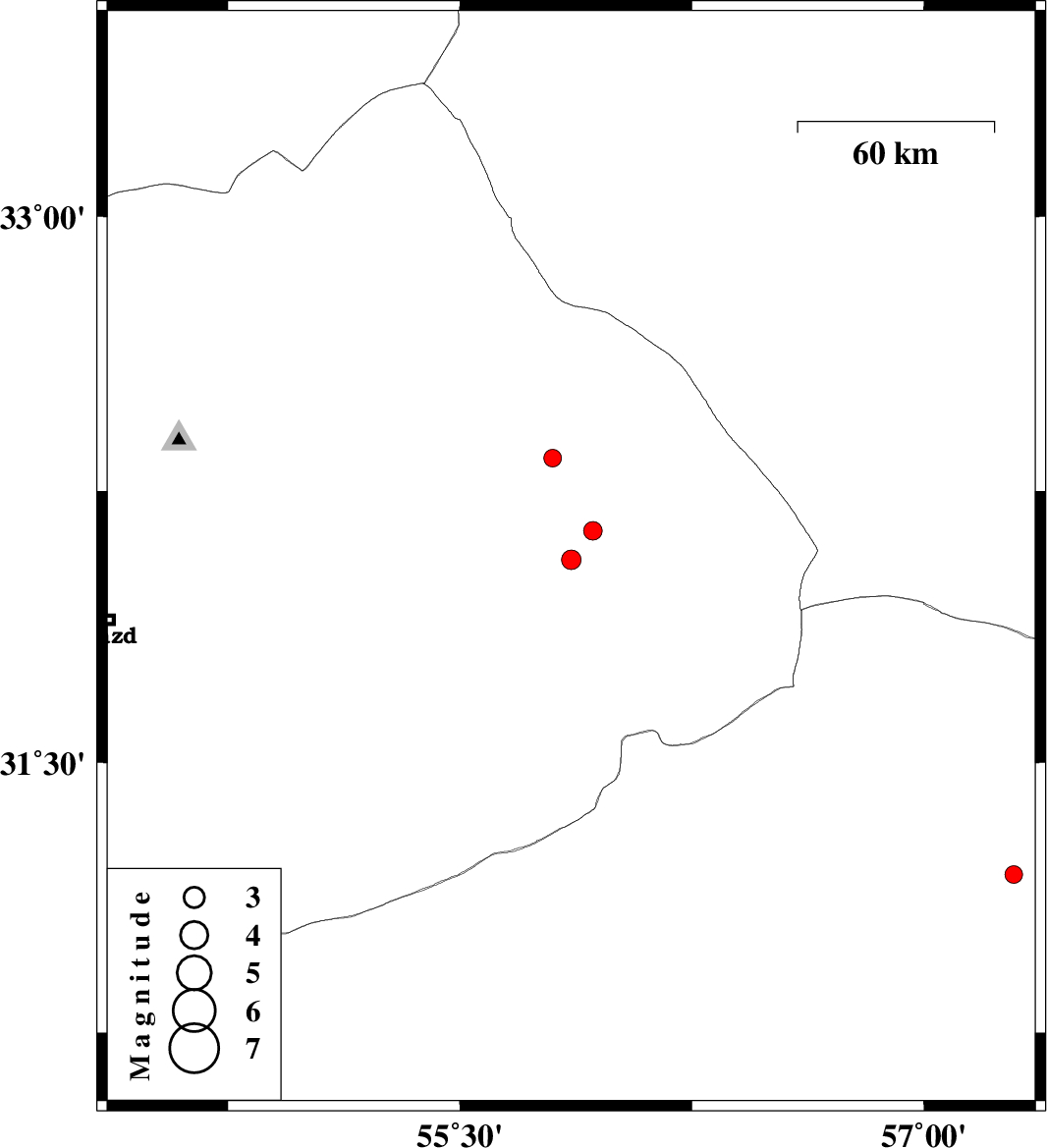 | 2012/06/04 | 17:55:14.4 | 22:25:14.4 | 32.14 | 55.93 | 15 | ML:2.7 | Yazd Province, 78 km North-East of Bafq |