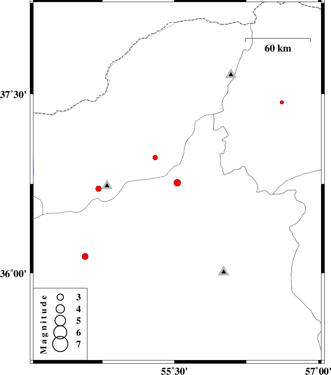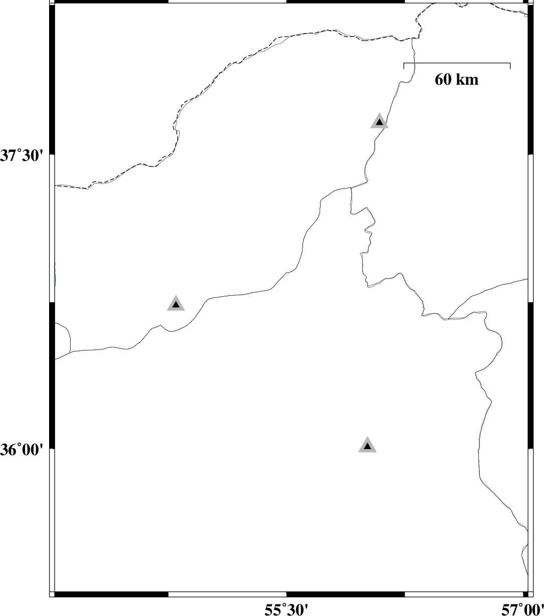 | 2012/06/26 | 23:55:56.0 | 04:25:56.0 | 36.97 | 55.3 | 14 | ML:2.3 | Golestan Province, 14 km East of Ramian | ||