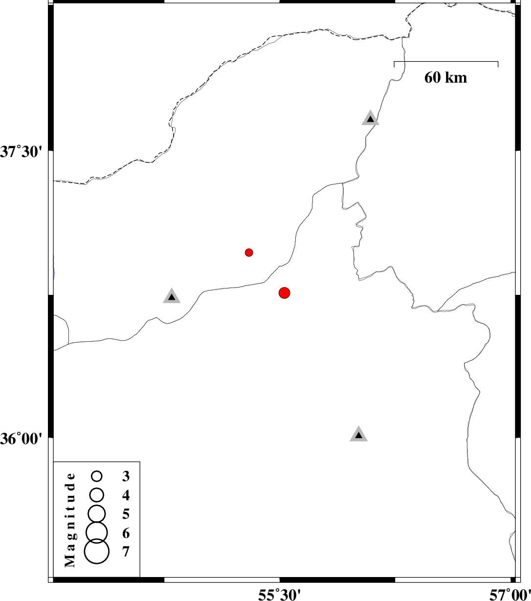 | 2012/06/26 | 23:55:56.0 | 04:25:56.0 | 36.97 | 55.3 | 14 | ML:2.3 | Golestan Province, 14 km East of Ramian |