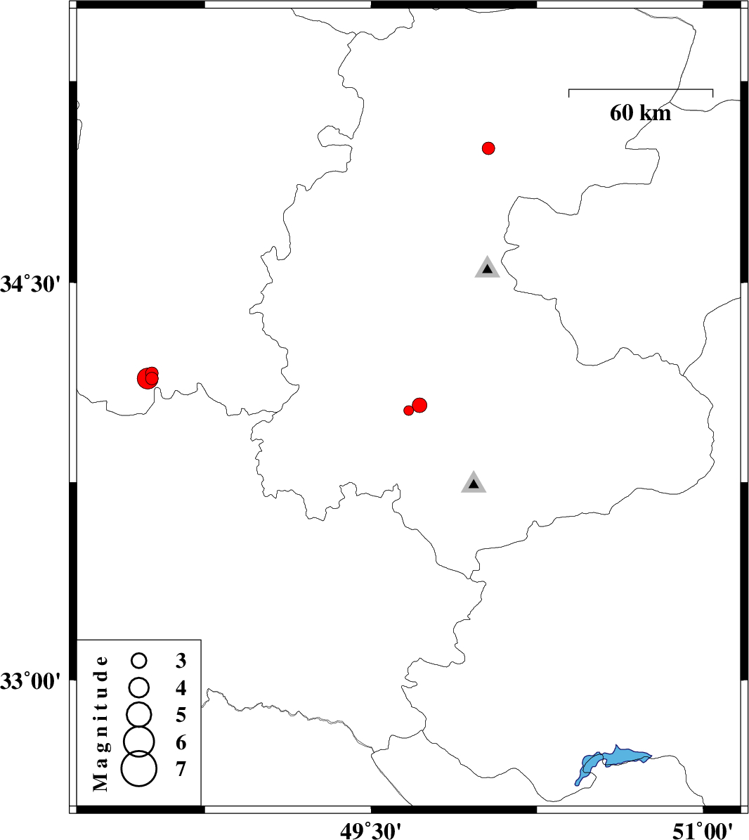 | 2012/06/28 | 17:24:10.7 | 21:54:10.7 | 34.14 | 48.51 | 15 | ML:2.5 | Hamedan Province, 15 km East of Nahavand | ||