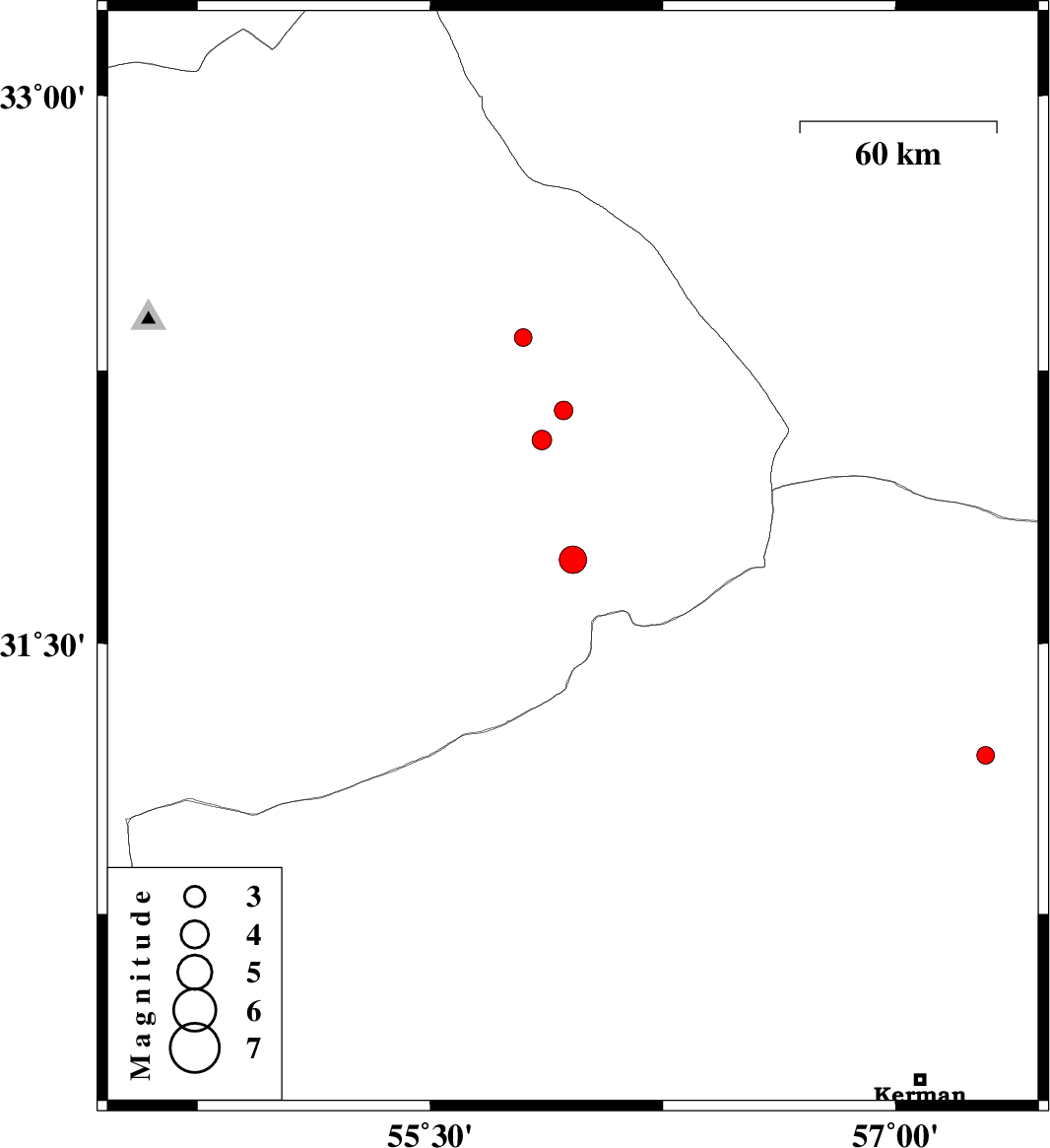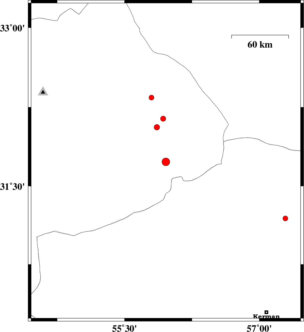 | 2012/06/13 | 05:43:52.3 | 10:13:52.3 | 31.19 | 57.29 | 14 | ML:2.5 | Kerman Province, 46 km East of Ravar | ||