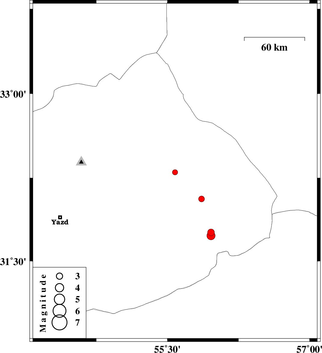 | 2012/07/02 | 12:18:18.1 | 16:48:18.1 | 32.06 | 55.86 | 14 | ML:2.8 | Yazd Province, 67 km North-East of Bafq |