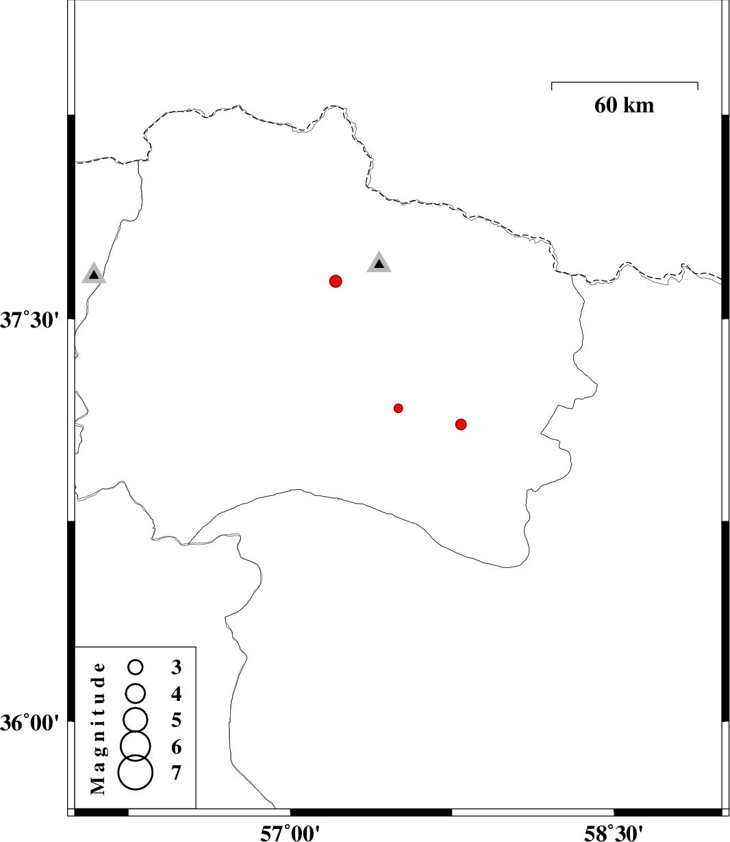 | 2012/06/09 | 06:02:11.4 | 10:32:11.4 | 37.64 | 57.21 | 18 | ML:2.5 | Khorasan(north) Province, 21 km North-West of Bojnurd |