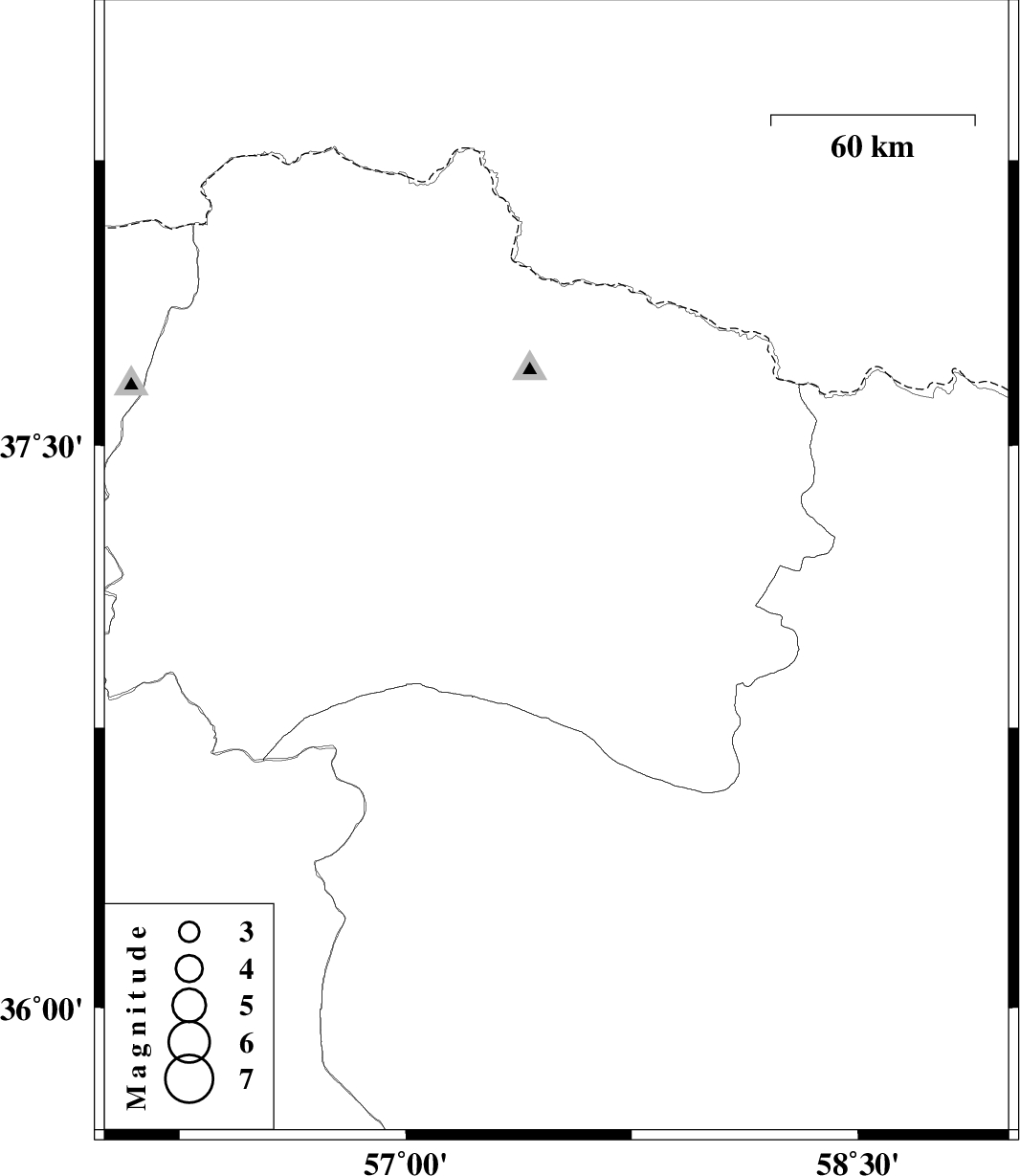 | 2012/07/09 | 13:38:40.2 | 18:08:40.2 | 37.17 | 57.5 | 38 | ML:1.9 | Khorasan(north) Province, 12 km North of Esfarayen |