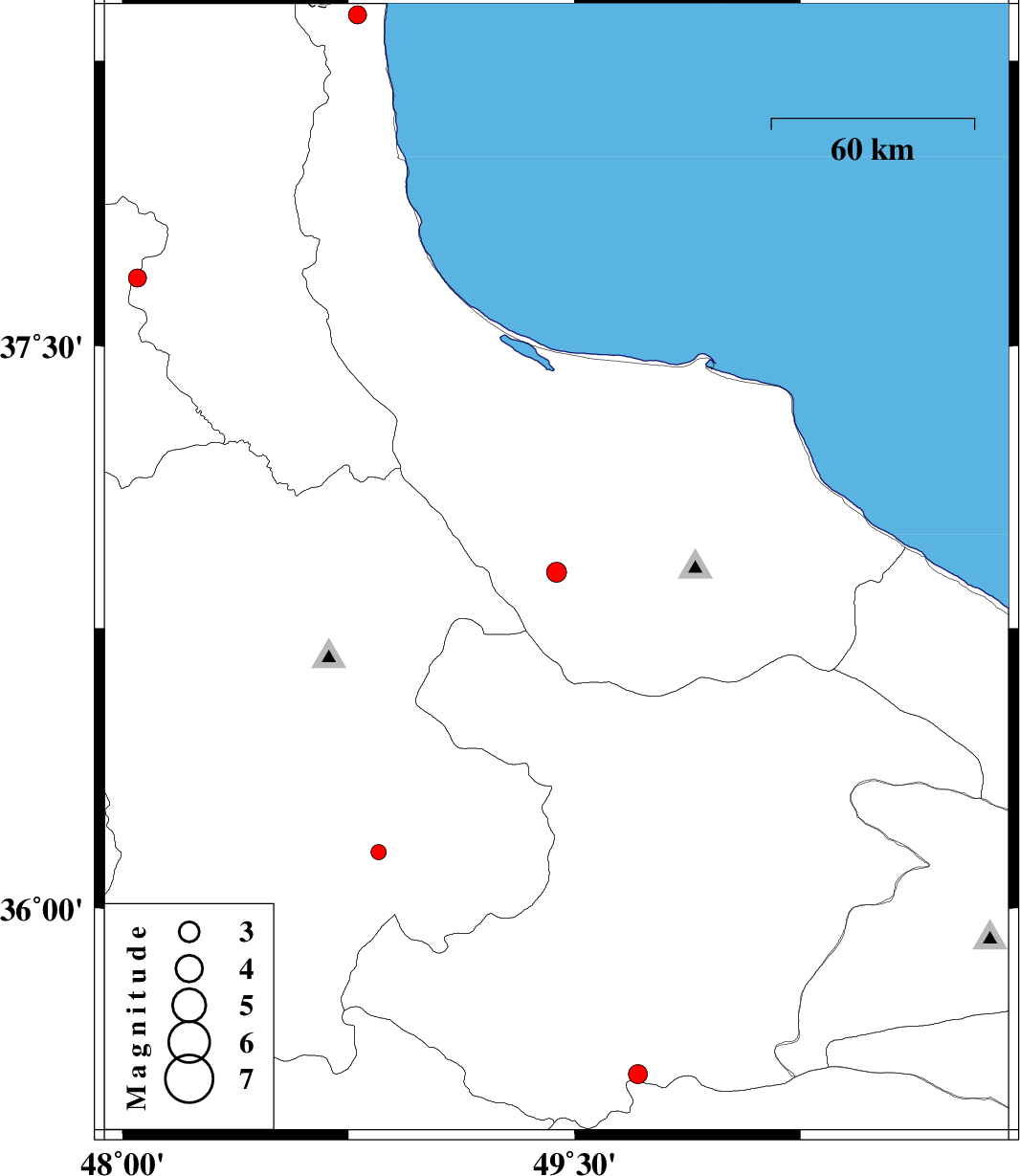 | 2012/06/26 | 02:56:21.1 | 07:26:21.1 | 37.68 | 48.05 | 14 | ML:2.7 | Ardebil Province, 30 km West of Givi | ||