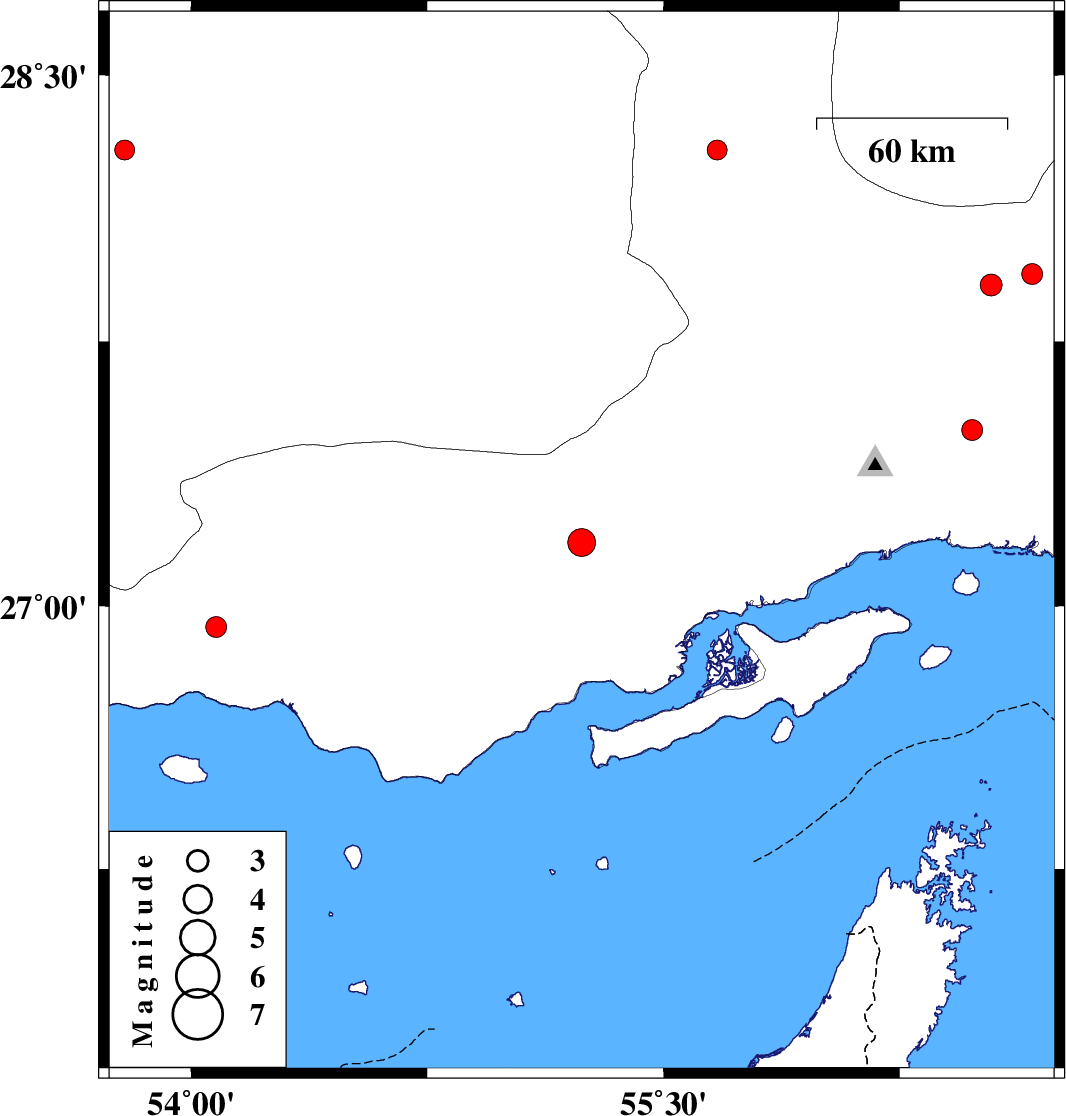 | 2012/06/25 | 22:29:48.6 | 02:59:48.6 | 26.94 | 54.08 | 38 | ML:2.9 | Hormozgan Province, 40 km South-West of Bastak | ||