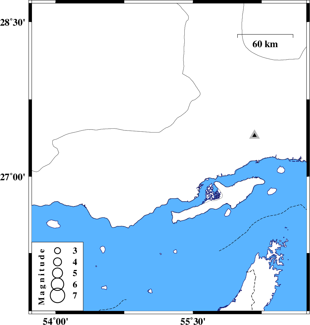 | 2012/07/12 | 21:18:30.0 | 01:48:30.0 | 27.18 | 55.24 | 39 | ML:4 | Hormozgan Province, 87 km East of Bastak |