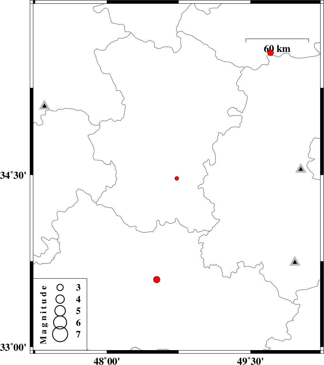 | 2012/07/11 | 22:55:27.2 | 03:25:27.2 | 33.59 | 48.52 | 16 | ML:3.1 | Lorestan Province, 18 km North-East of Khorramabad | ||