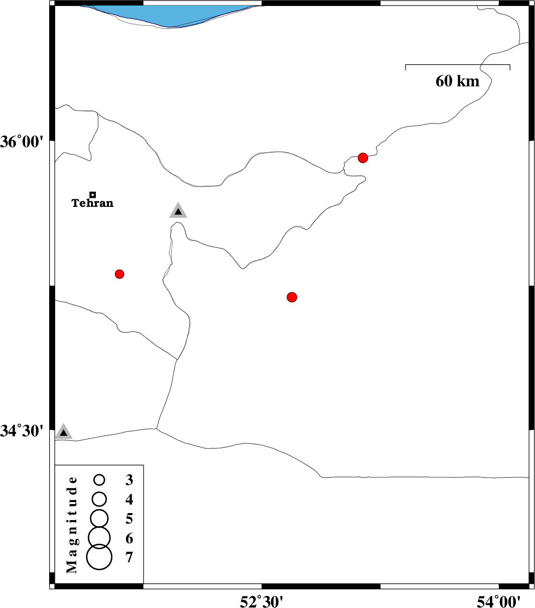 | 2012/07/19 | 08:17:01.3 | 12:47:01.3 | 35.19 | 52.69 | 25 | ML:2.8 | Semnan Province, 32 km East of Garmsar | ||