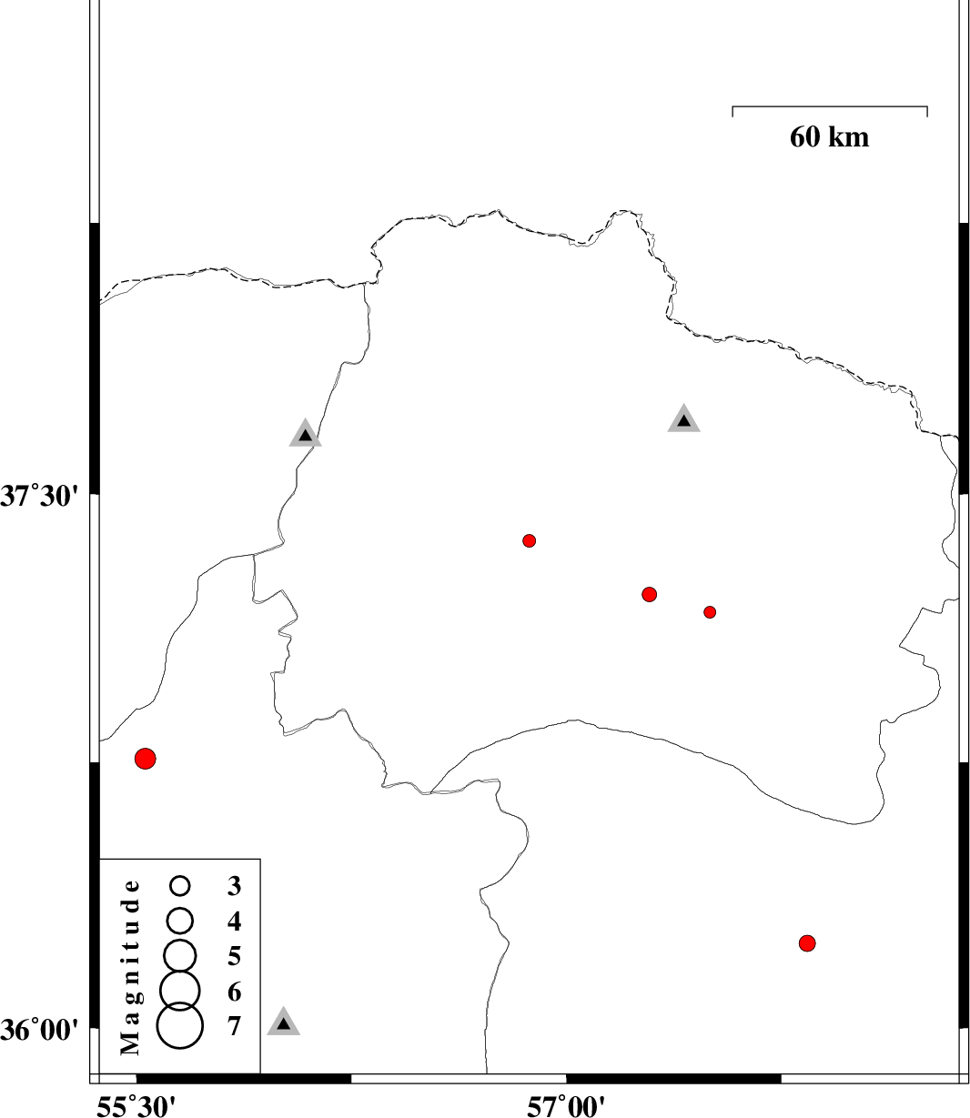 | 2012/07/20 | 17:57:10.3 | 22:27:10.3 | 37.37 | 56.87 | 37 | ML:2 | Khorasan(north) Province, 21 km South of Ashkhaneh | ||