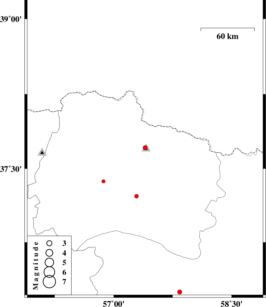 | 2012/07/20 | 17:57:10.3 | 22:27:10.3 | 37.37 | 56.87 | 37 | ML:2 | Khorasan(north) Province, 21 km South of Ashkhaneh | ||