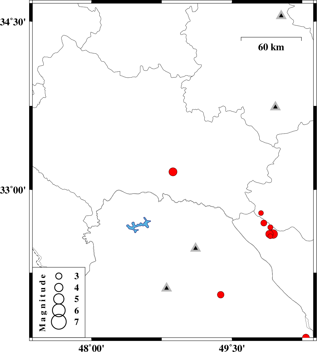 | 2012/07/23 | 12:53:02.2 | 17:23:02.2 | 32.79 | 49.81 | 7 | ML:2.4 | Esfahan Province, 33 km South-West of Fereydunshahr | ||