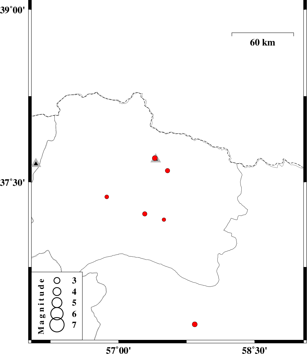 | 2012/07/23 | 04:45:59.0 | 09:15:59.0 | 37.6 | 57.54 | 14 | ML:2.2 | Khorasan(north) Province, 23 km North-East of Bojnurd | ||