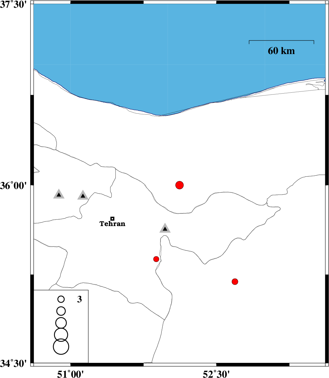 | 2012/07/19 | 08:17:01.3 | 12:47:01.3 | 35.19 | 52.69 | 25 | ML:2.8 | Semnan Province, 32 km East of Garmsar |