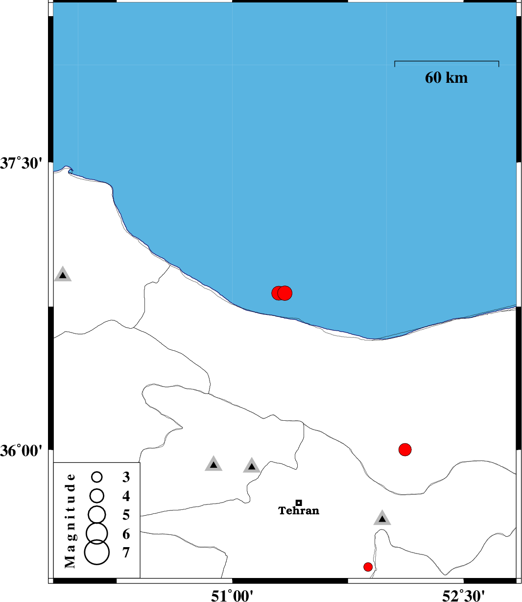 | 2012/07/27 | 21:39:04.5 | 02:09:04.5 | 36.82 | 51.34 | 7 | ML:4.2 | Caspian Sea, 20 km North of Chalus | ||