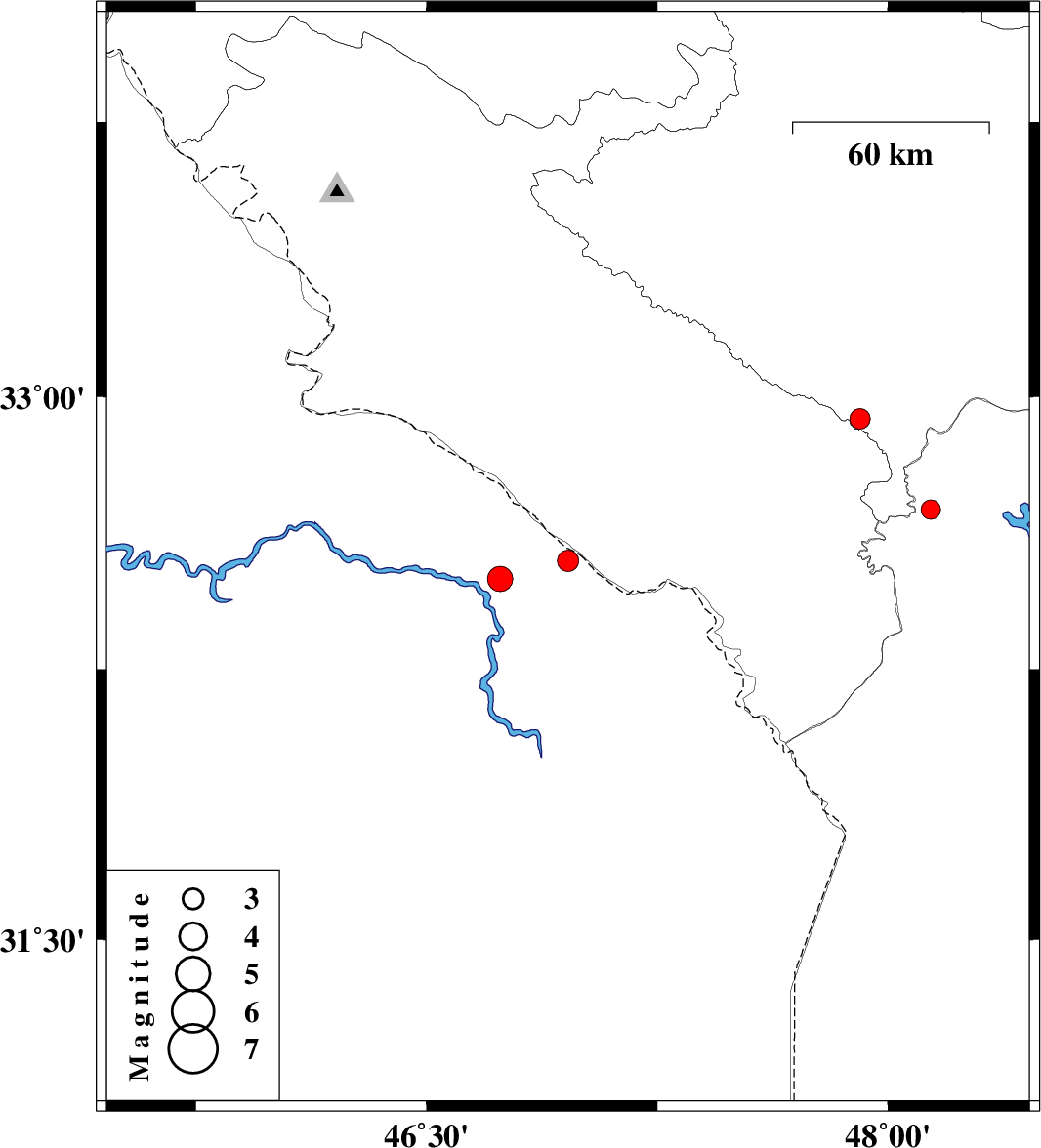 | 2012/07/28 | 06:09:54.6 | 10:39:54.6 | 32.55 | 46.96 | 14 | ML:3.1 | Iraq, 32 km South-West of Dehloran | ||