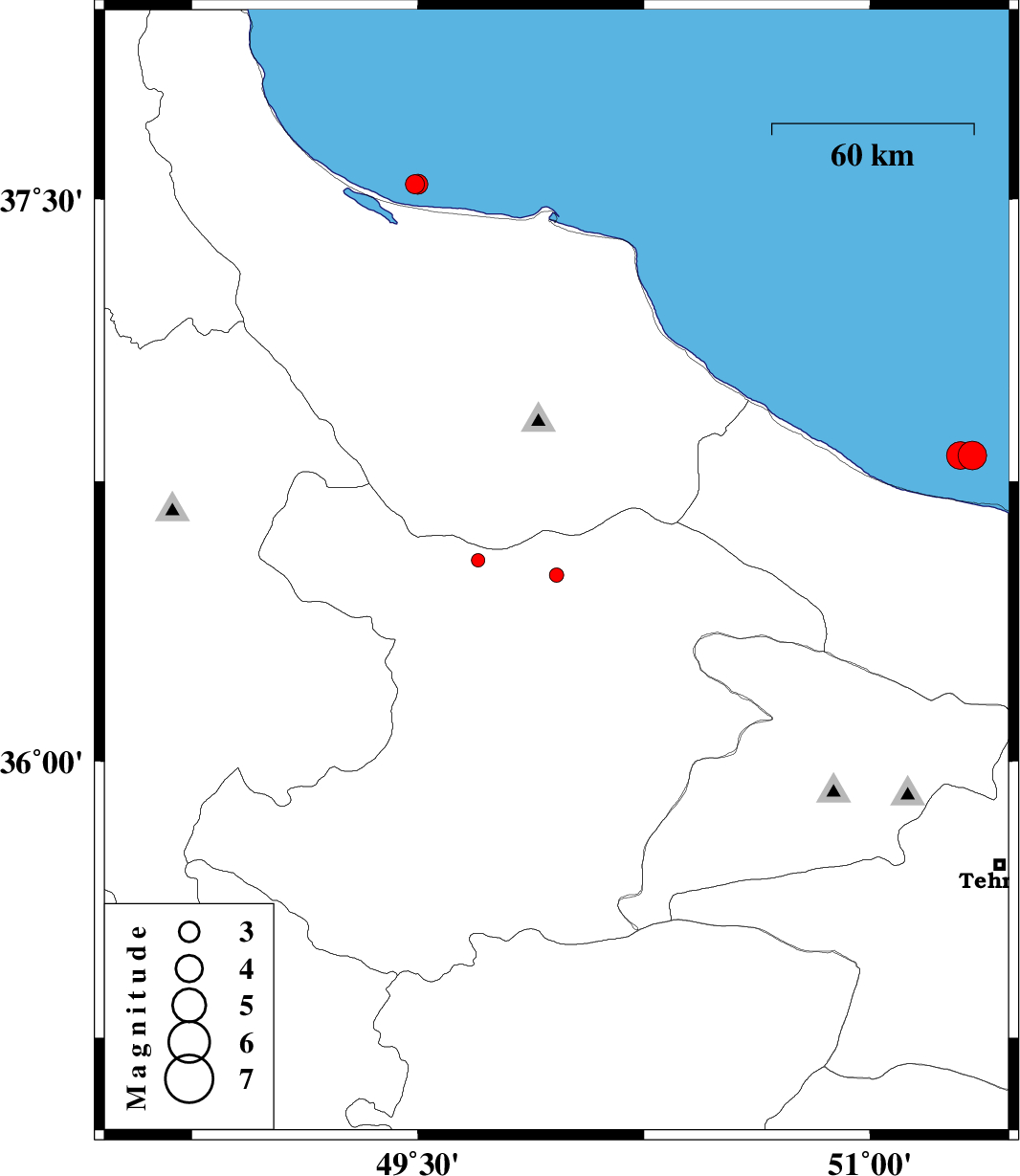 | 2012/07/27 | 21:39:04.5 | 02:09:04.5 | 36.82 | 51.34 | 7 | ML:4.2 | Caspian Sea, 20 km North of Chalus | ||