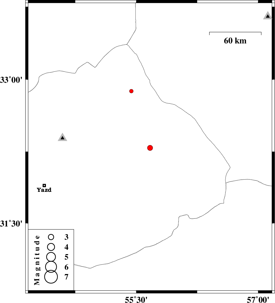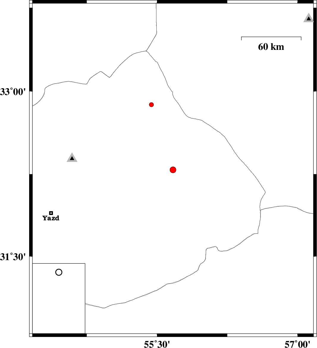 | 2012/07/26 | 23:15:30.0 | 03:45:30.0 | 32.88 | 55.44 | 16 | ML:2.1 | Yazd Province, 142 km North of Bafq |
