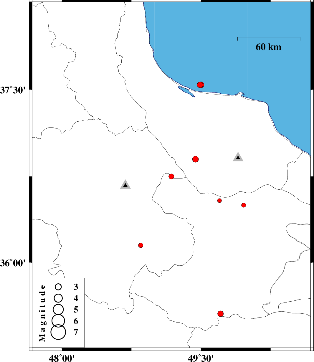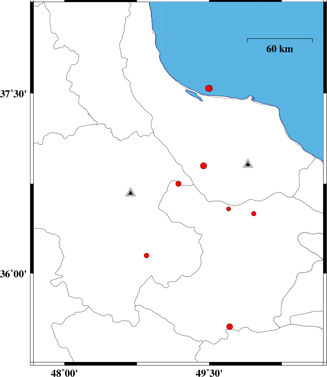 | 2012/07/29 | 04:56:14.9 | 09:26:14.9 | 37.54 | 49.49 | 14 | ML:2.8 | Caspian Sea, 7 km Bandar-e anzali | ||