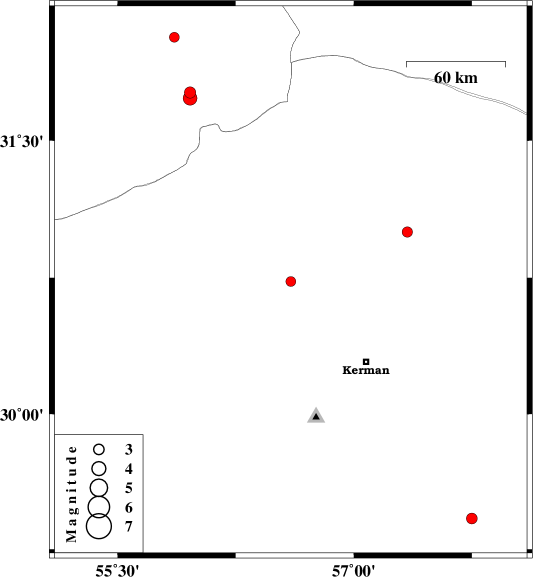 | 2012/07/02 | 12:18:18.1 | 16:48:18.1 | 32.06 | 55.86 | 14 | ML:2.8 | Yazd Province, 67 km North-East of Bafq |