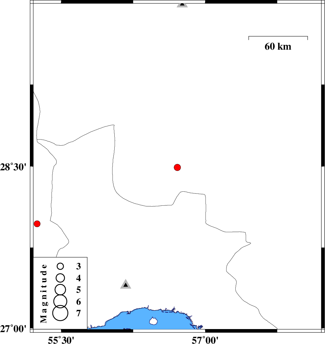| 2012/07/30 | 17:18:19.8 | 21:48:19.8 | 27.97 | 55.25 | 14 | ML:2.9 | Fars Province, 74 km South-West of Hajiabad |