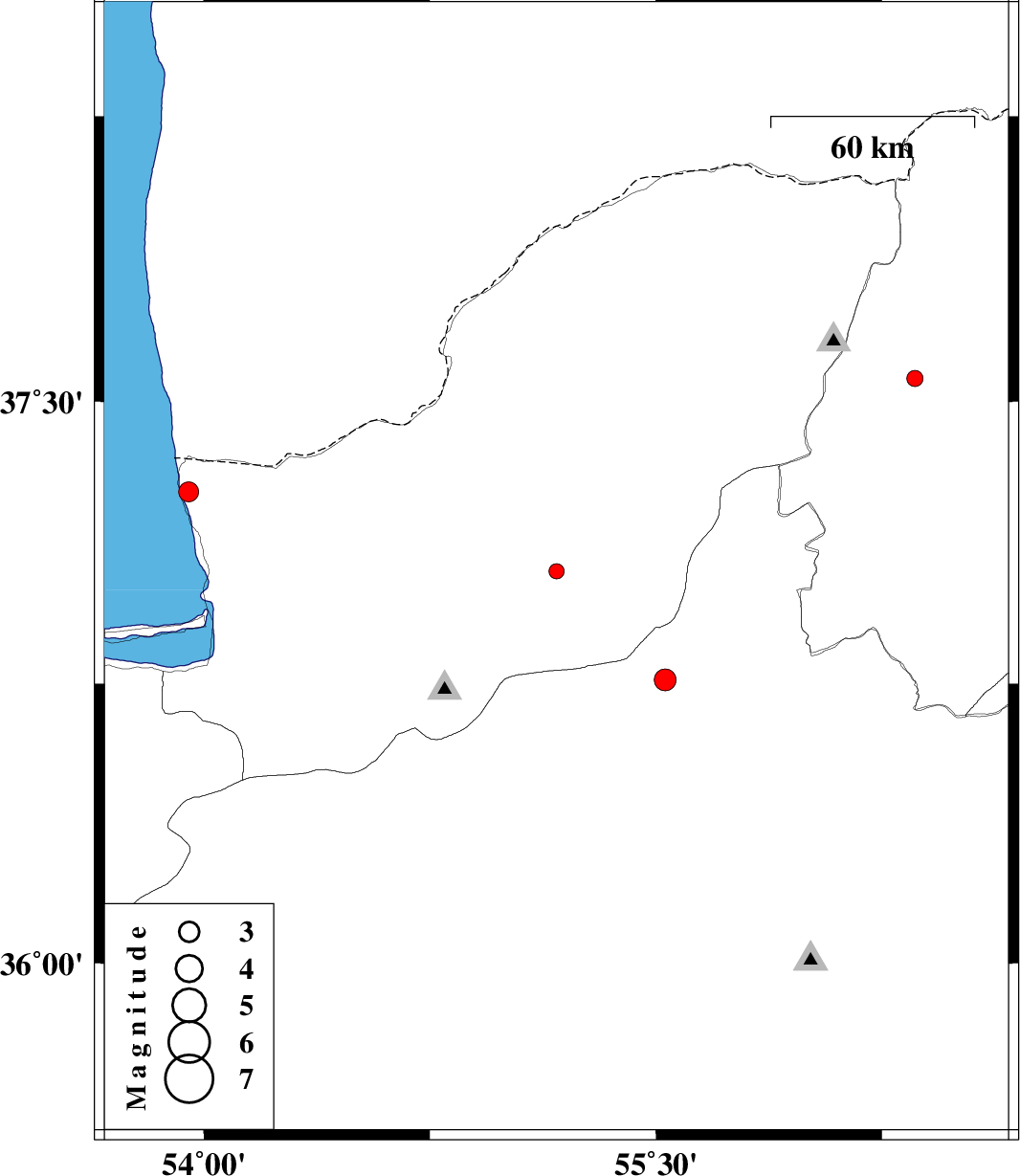 | 2012/07/04 | 07:30:31.8 | 12:00:31.8 | 37.26 | 53.95 | 14 | ML:3 | Golestan Province, 42 km North-West of Bandar-e torkaman | ||
