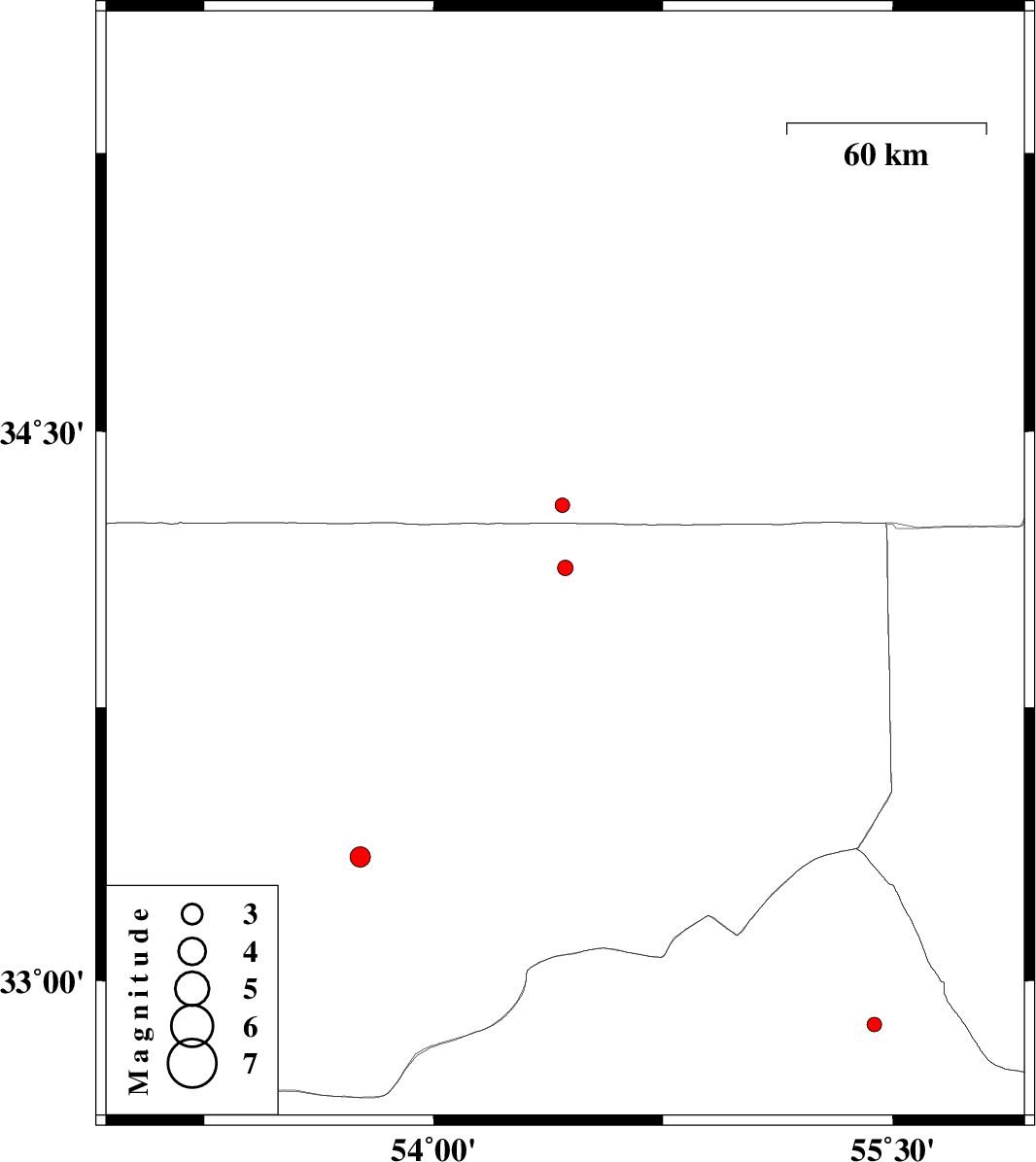 | 2012/07/26 | 23:15:30.0 | 03:45:30.0 | 32.88 | 55.44 | 16 | ML:2.1 | Yazd Province, 142 km North of Bafq |