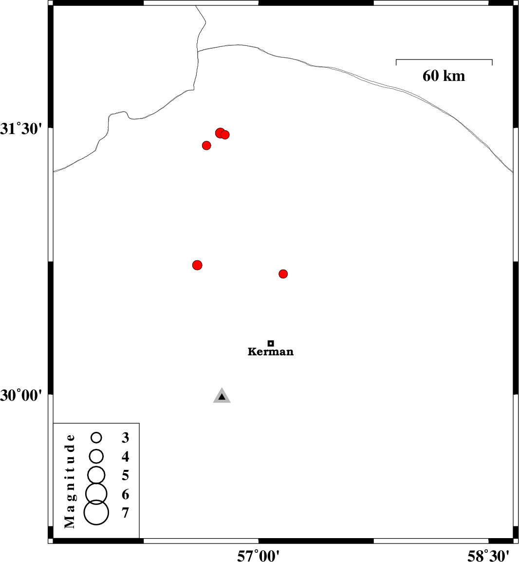 | 2012/08/02 | 09:41:29.9 | 14:11:29.9 | 31.4 | 56.66 | 14 | ML:2.5 | Kerman Province, 21 km North-West of Ravar | ||