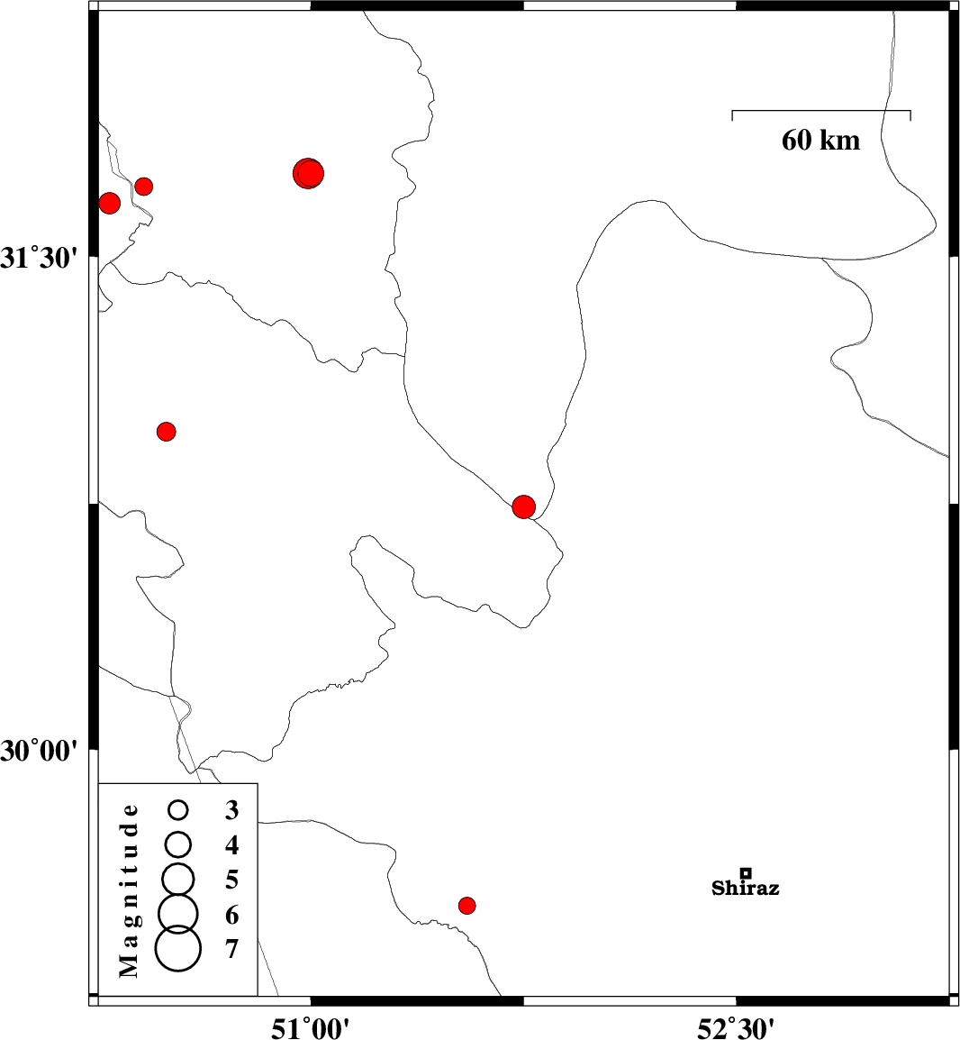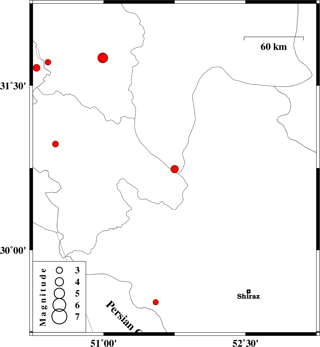 | 2012/07/06 | 00:20:35.4 | 04:50:35.4 | 29.52 | 51.55 | 6 | ML:2.7 | Fars Province, 15 km West of Kazerun |