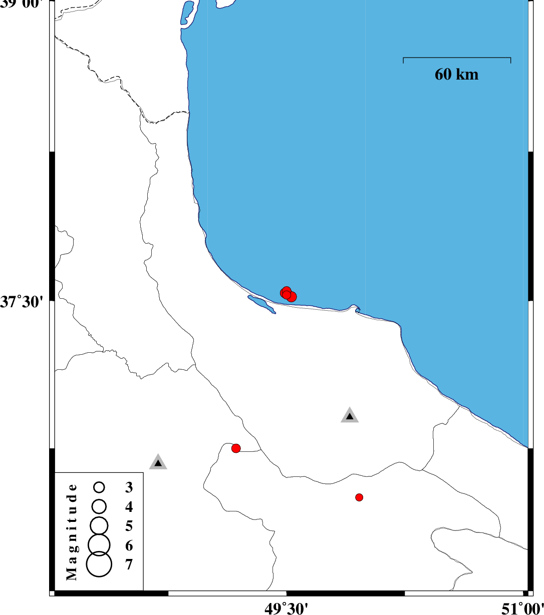 | 2012/08/02 | 11:06:03.5 | 15:36:03.5 | 37.52 | 49.53 | 14 | ML:3 | Caspian Sea, 8 km Bandar-e anzali | ||