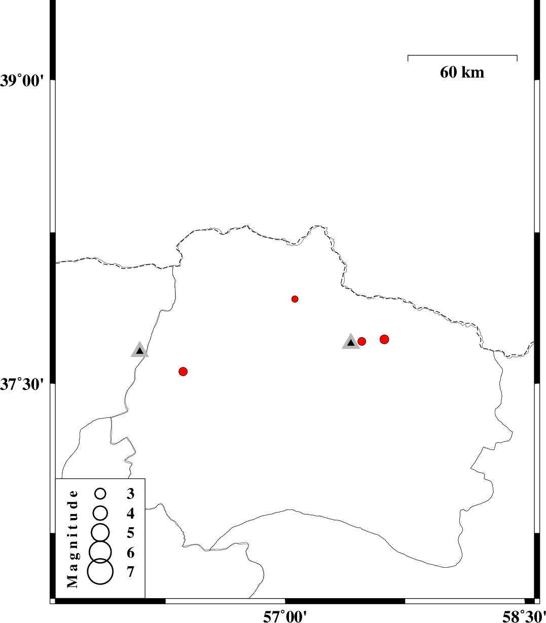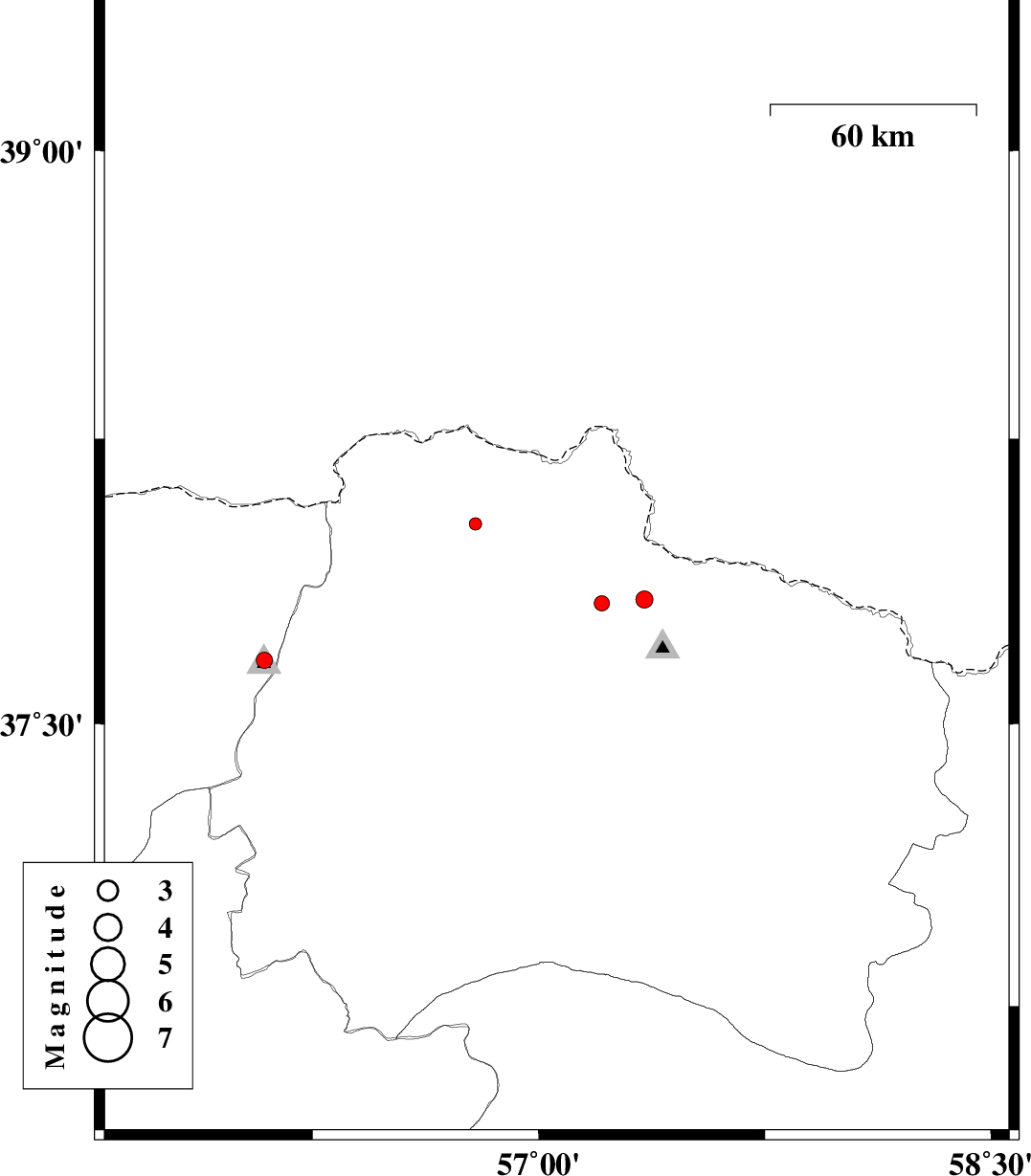 | 2012/07/26 | 07:13:44.7 | 11:43:44.7 | 37.72 | 57.62 | 29 | ML:2.6 | Khorasan(north) Province, 37 km North-East of Bojnurd |
