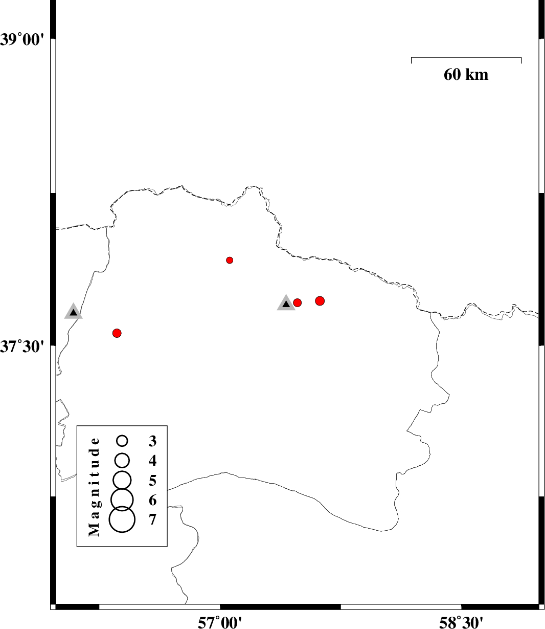 | 2012/07/26 | 07:13:44.7 | 11:43:44.7 | 37.72 | 57.62 | 29 | ML:2.6 | Khorasan(north) Province, 37 km North-East of Bojnurd |